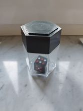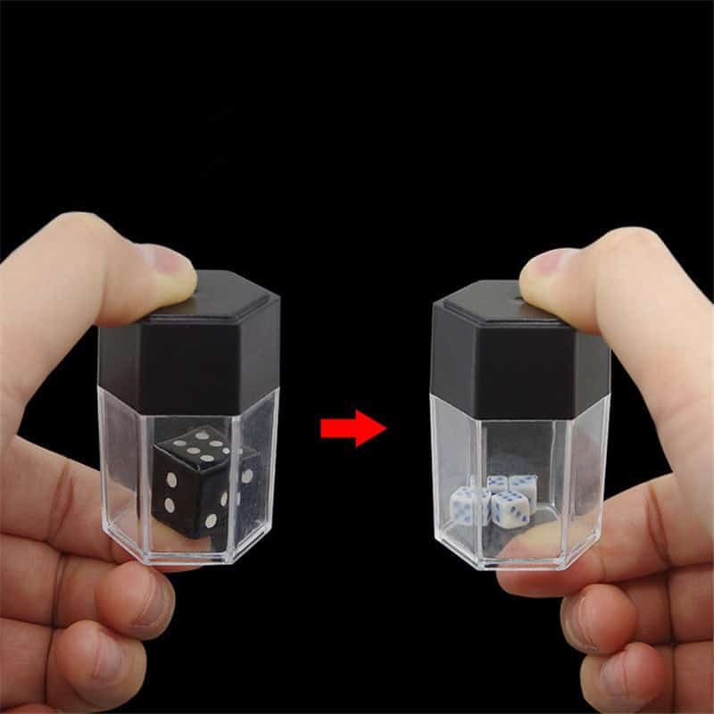 The magicians show one large die sealed inside a transparent container.