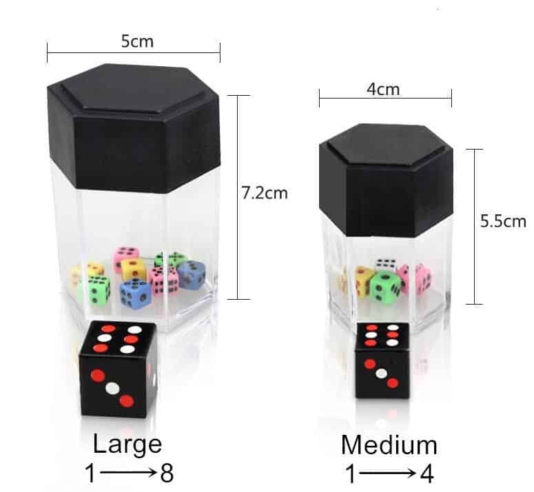 The container is opened and the small dice can be examined by the audience while the large dice vanishes without a trace.
