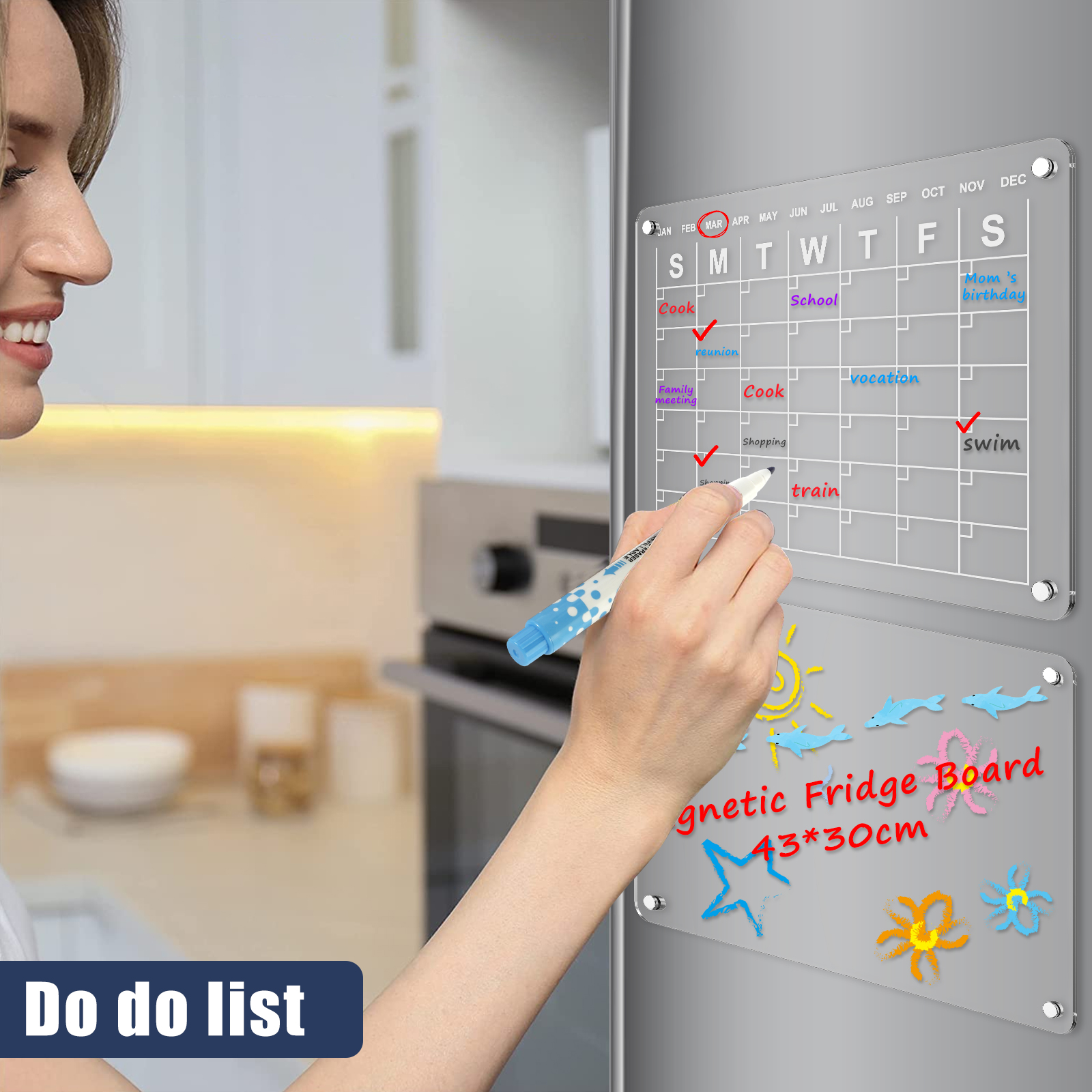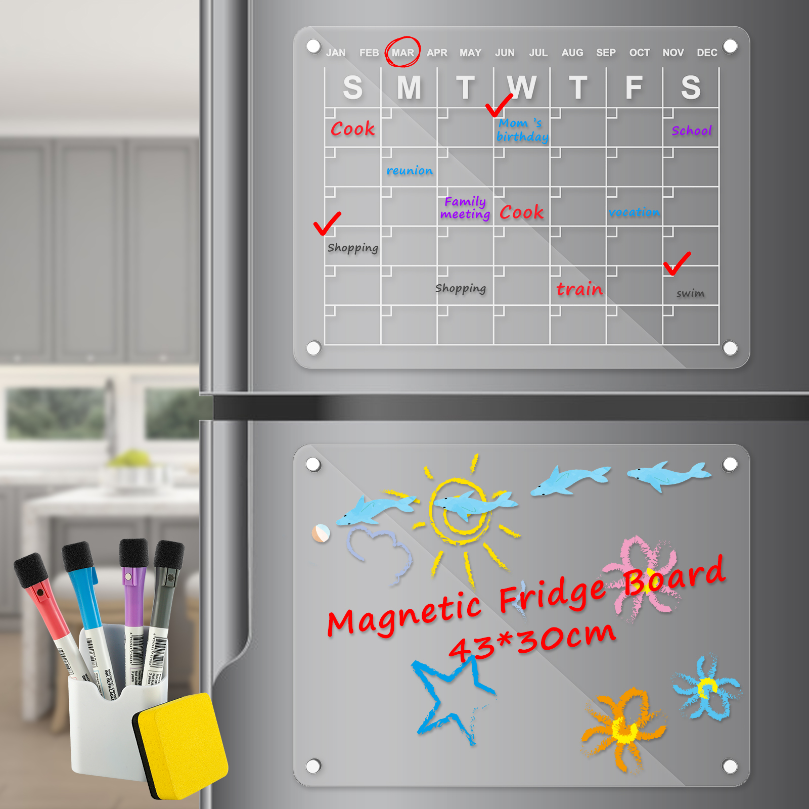 [Strong Magnetic Design] This acrylic magnetic dry erase board calendar is equipped with strong and durable magnets. Make it stick tightly to the refrigerator. Not slip off even when closing the refrigerator door. The rounded corners magnets make it easy to remove without any creases.