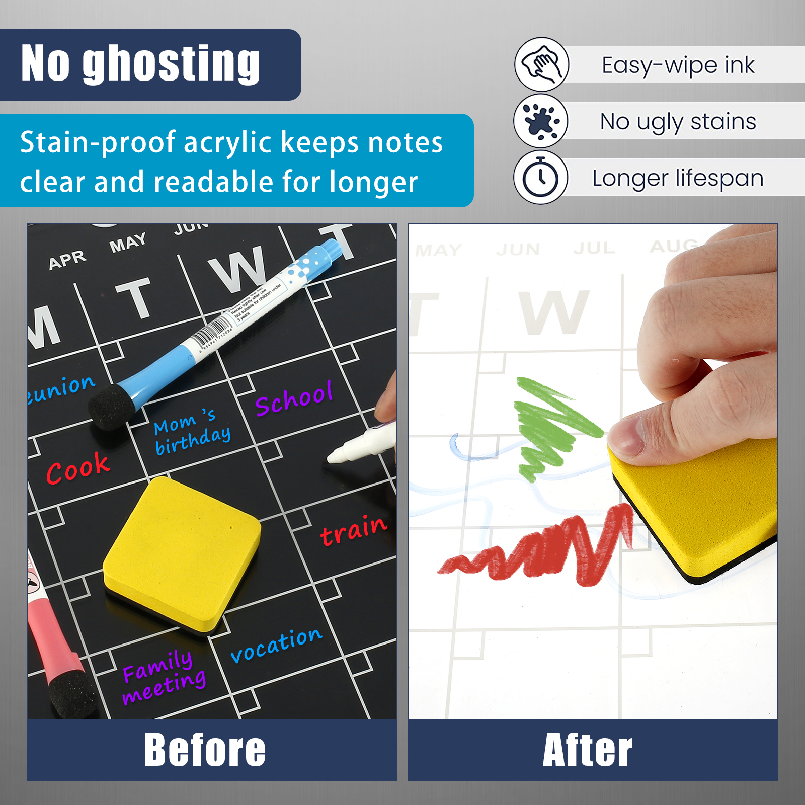 ✏️【Ultra Clear Marker & Easy Erase】This dry erase board calendar set includes a marker and a calendar,the markers write very smoothly, the writing is clear, easy to clean, and the fast-drying ink prevents fading and smudging. And the mark is easy to erase without leaving marks or ghosting, you just need to wipe it off with a blackboard eraser or a damp cloth to reuse it again.