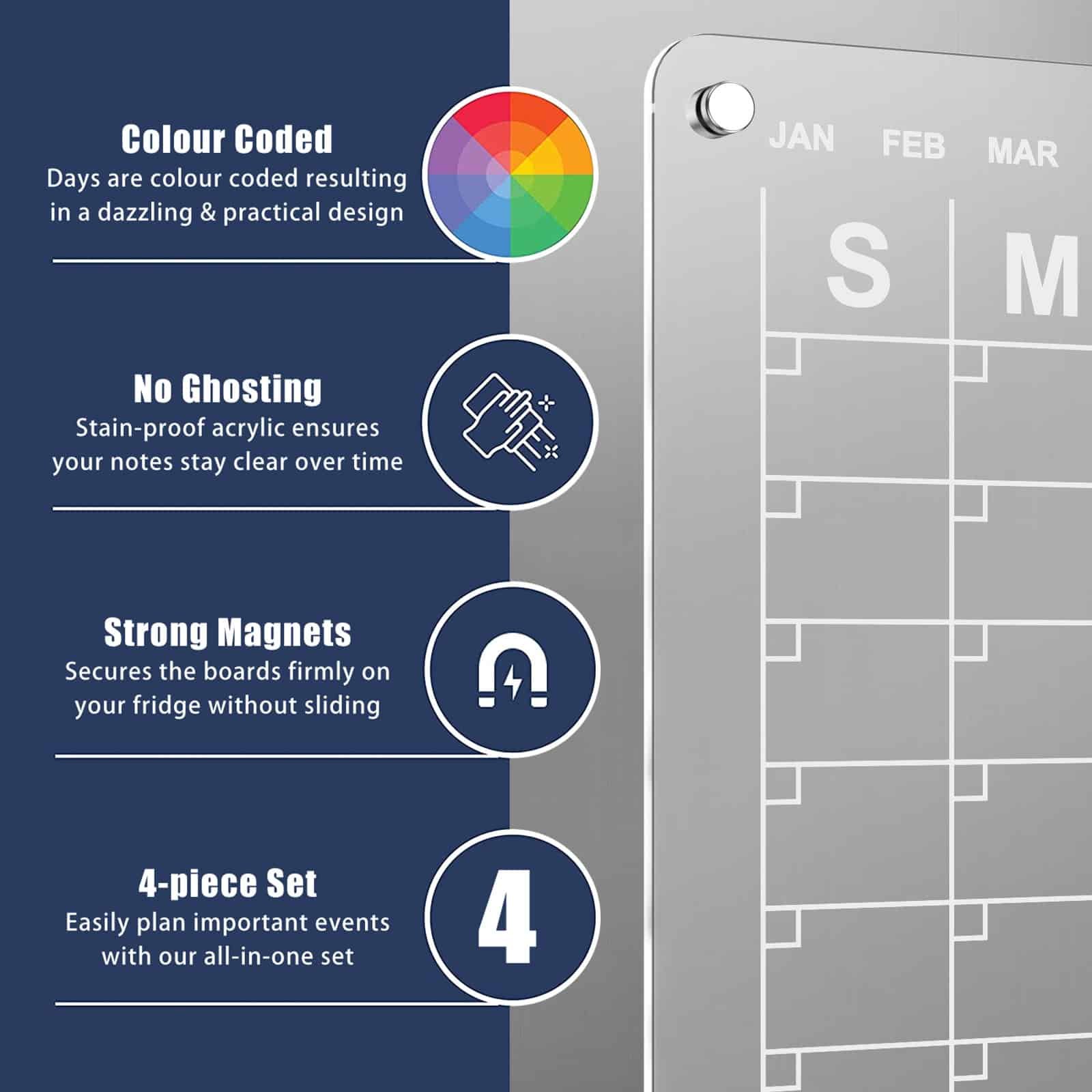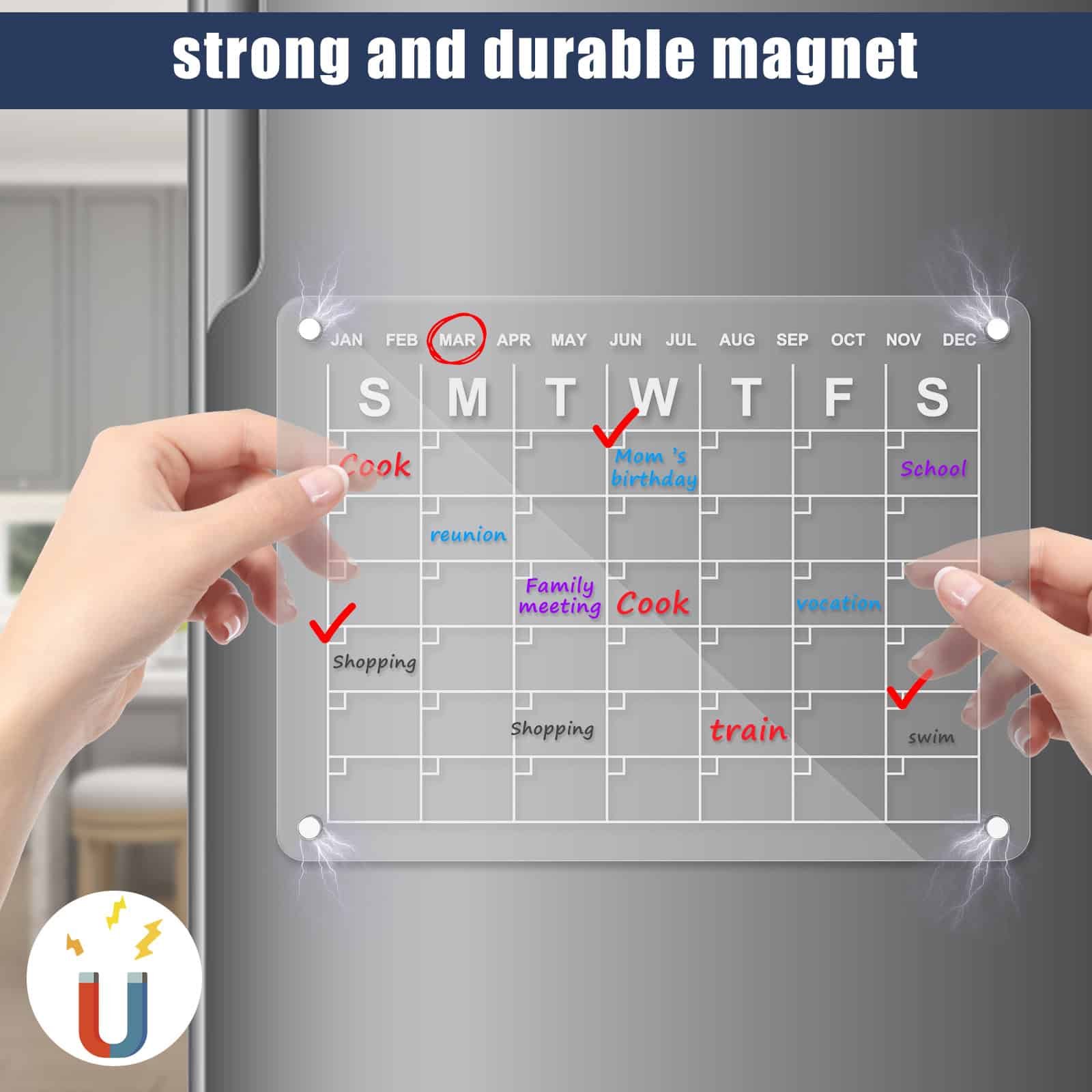 [Strong Magnetic Design] This acrylic magnetic dry erase board calendar is equipped with strong and durable magnets. Make it stick tightly to the refrigerator. Not slip off even when closing the refrigerator door. The rounded corners magnets make it easy to remove without any creases.