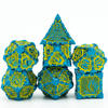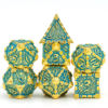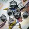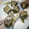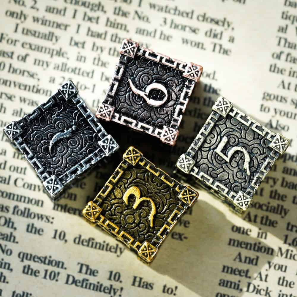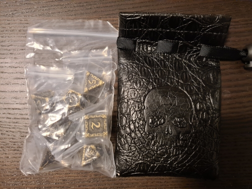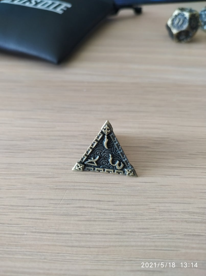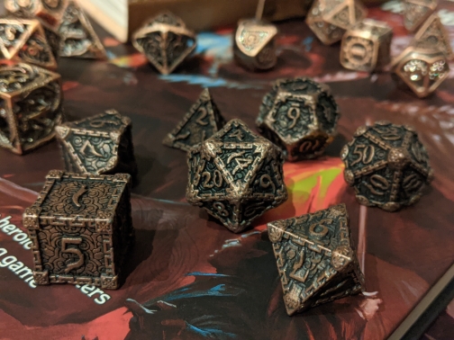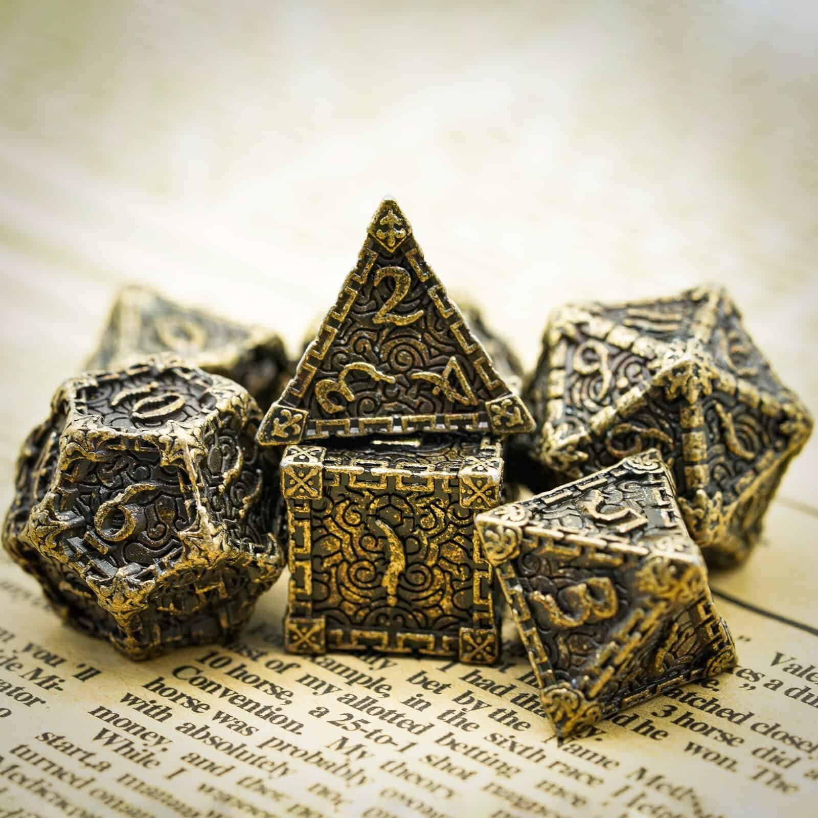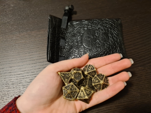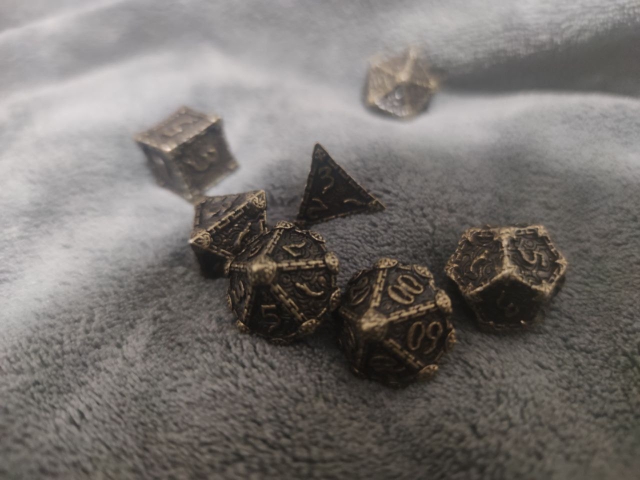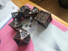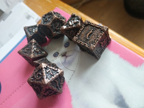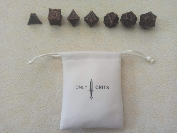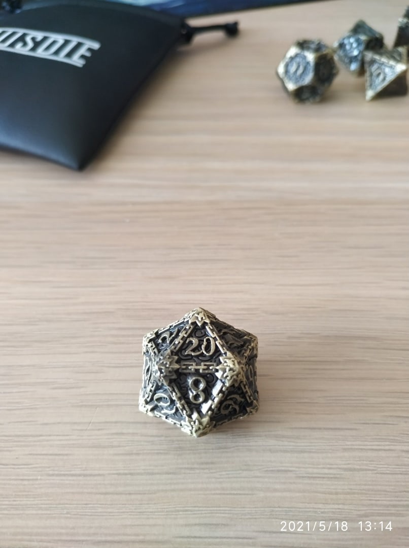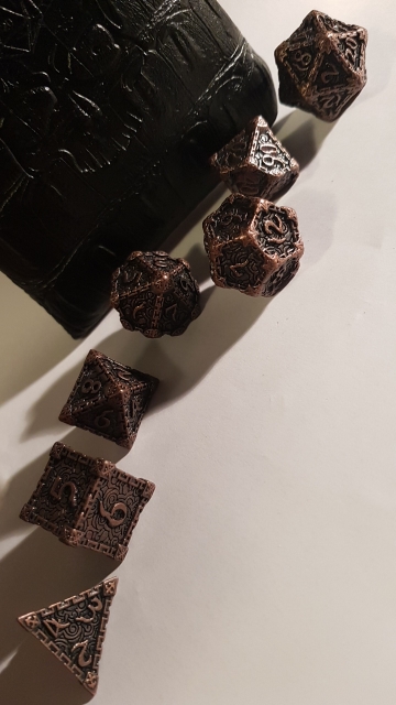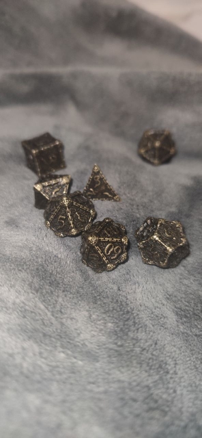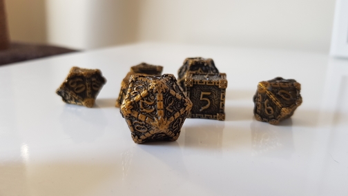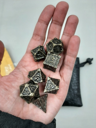 Heavy, Beautiful, Intricate and qualitative dice set. I was not a big fan of metal dice before but i'm really amazed by this set.