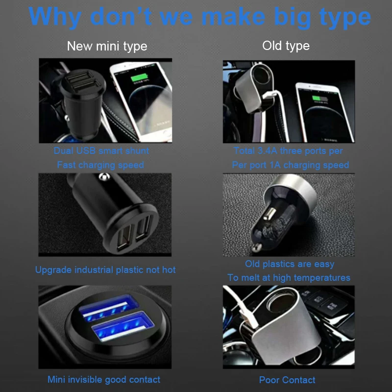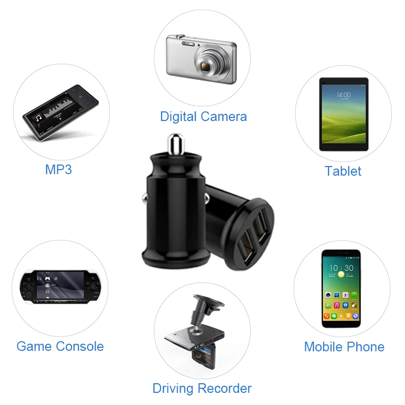This Mini Dual USB Car Charger allows you to simultaneously charge two devices at full speed. Advanced circuitry and built-in safeguards protect your devices against excessive current, overheating, and overcharging. Turn your unused cigarette lighter outlet in your car into two powerful USB charging ports! A MUST HAVE for all cars!