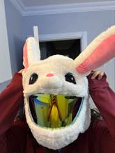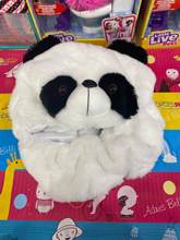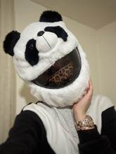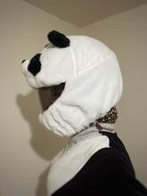Caps helmet perfectly. Recommended it from behind and then forward so gets better. Fabric not bad, washable and very soft. Looks like a real panda
