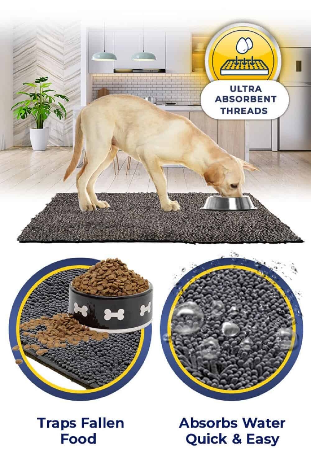 Our Mat will trap any fallen kibble, and absorb All Water For a Quick and Easy Clean Up!