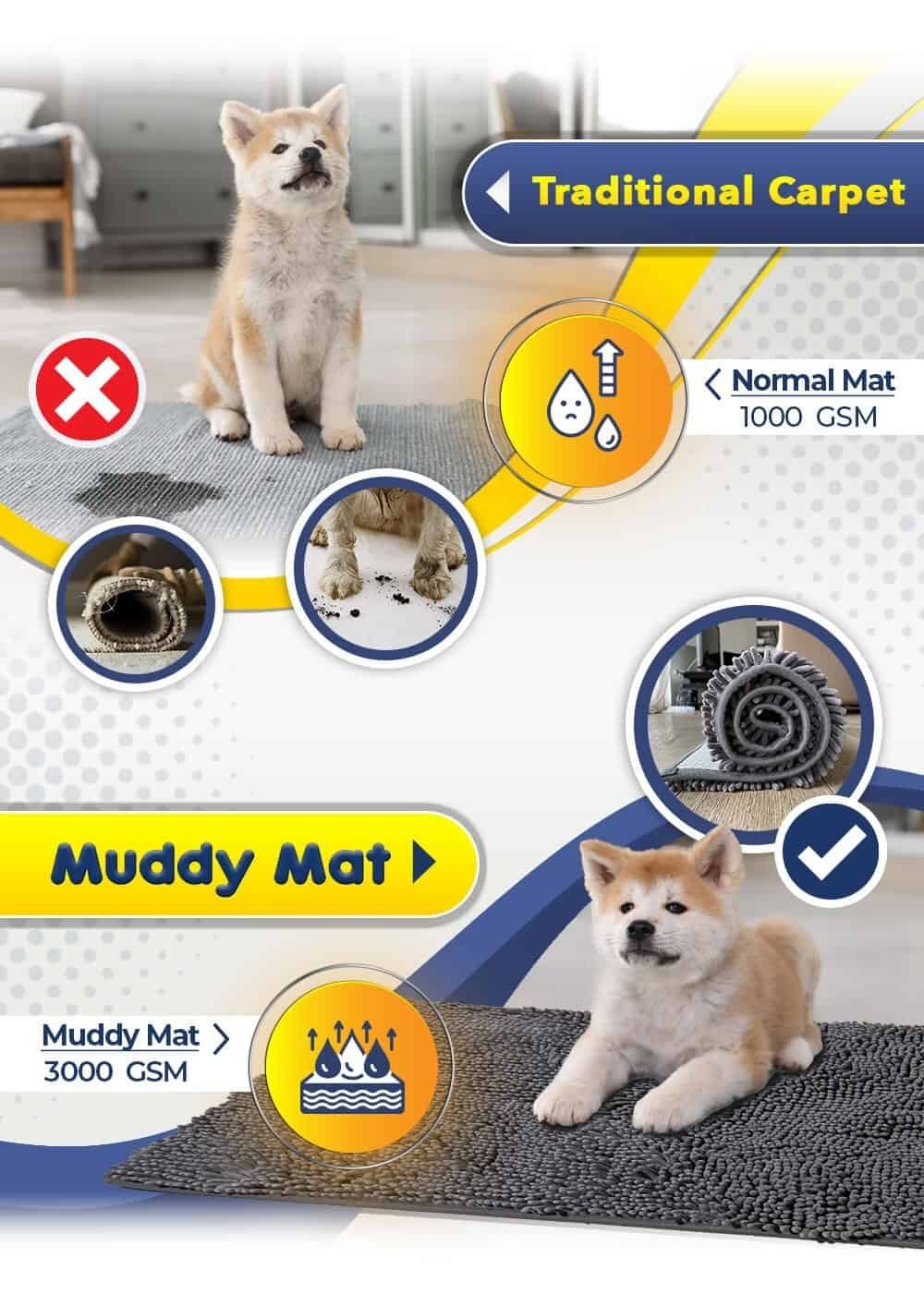 CLEANS MUDDY FEET & PAWS Getting on your knees to wipe and rub mud from plush paws with a pile of dirty rag is a thing of the past. Muddy Mat absorbs water, mud, and dirt from paws which makes clean floors easier to maintain. Give warmth and high comfort to your furry friends.