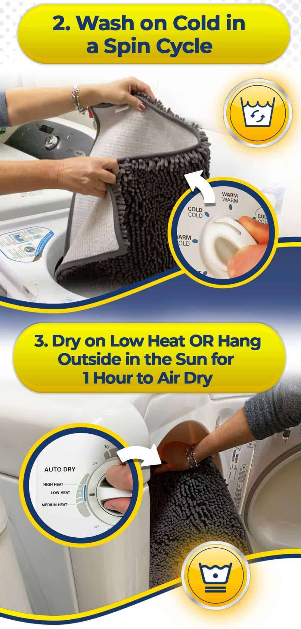 MACHINE WASH AND DRYER FRIENDLY: For a quick & easy cleaning on the Muddy Mat, you can simply give it a good shake, and see all the debris falling out. For a deep clean, machine wash individually in cold water using mild detergent, to dry, use the tumble setting on low heat. For extra fluff you can use fabric softener.