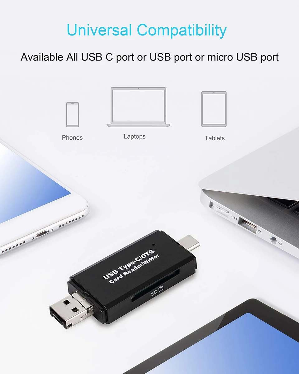 - 1.Multi Card Reader2.100% brand new and high quality3.Available all USB C port or USB port or Micro USB port4.High speed for copying and downloading5.Support all Type-C computer and mobile phone6.support all Android phone which have OTG function7.support systems: Windows/macOS, etc