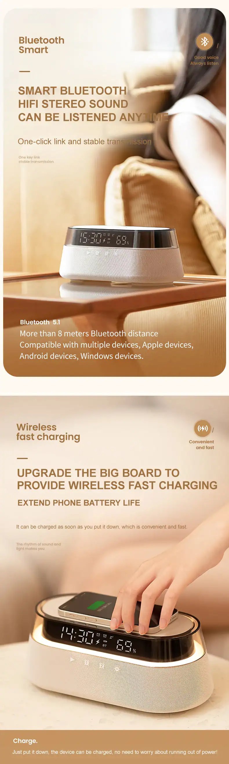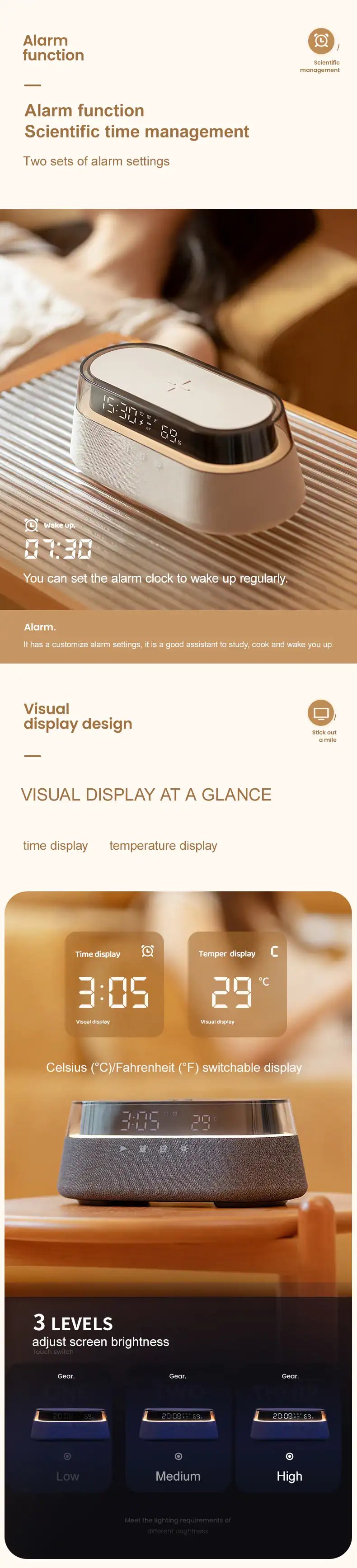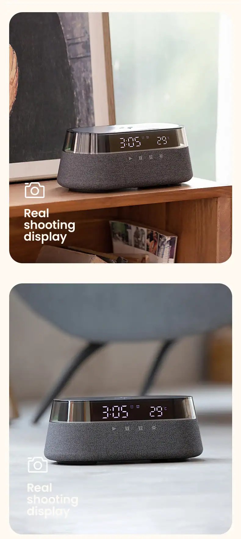 [Multi-functional Design]—This alarm clock combines a Speaker, FM radio, Wireless Charger, Power-off memory and Night light into one convenient device, making it an ideal alarm clock for bedroom use.