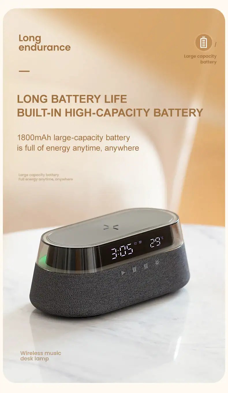 Portable music BT speaker with LED temperature and humidity display snooze 2 alarm clock wireless charger
