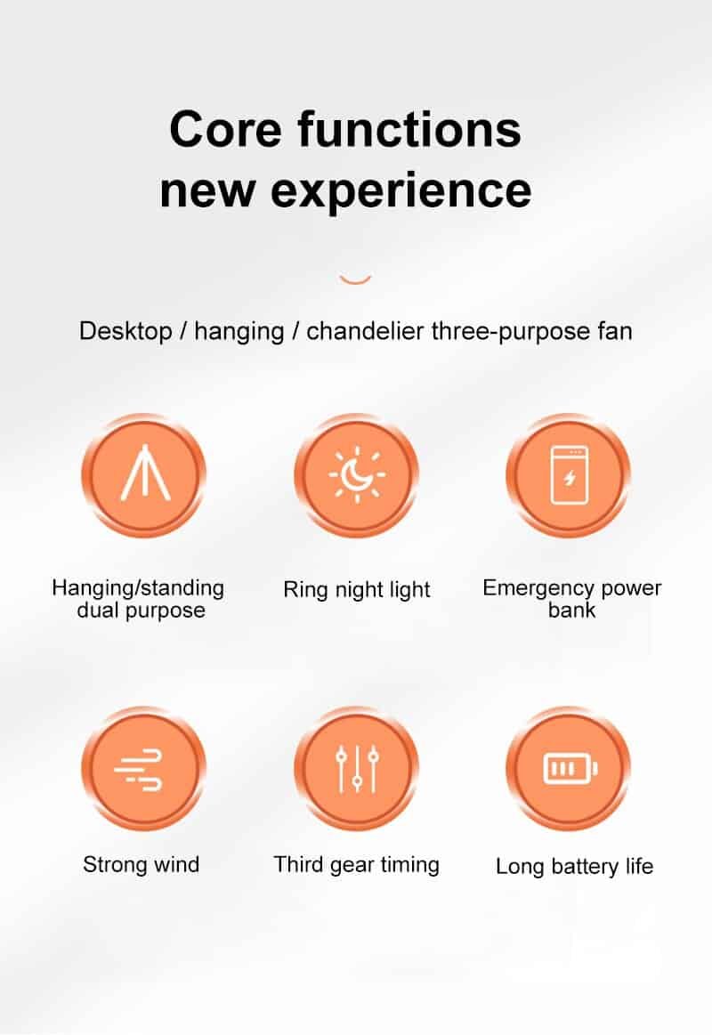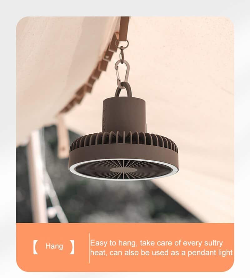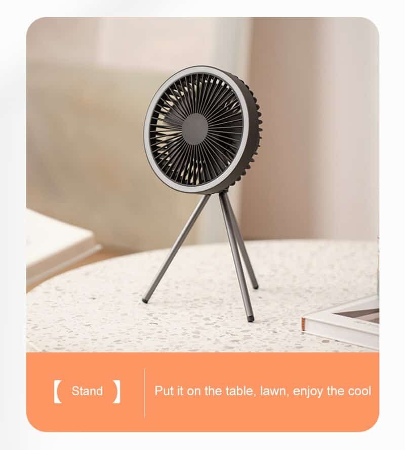 Going on a camping trip with your family this weekend? Our Multifunctional tripod fan is a must-have thing you need on this trip! This fan has a built-in 10000 mAh polymer battery, which can last 8-27 hours depending on the wind speed. In addition, it has a circle of LED lights with 3 brightness settings. With 360-degree rotation manually, you could feel the airflow from the desired direction. It can be adjusted up and down manually to realize a multi-angle air supply, not disturb your sleep, work, and study, and enjoy the cool as you like. Moreover, it has a hidden hook, which can be hung on your tent or car. The Multifunctional tripod fan is suitable for hiking, camping, motor home, travel, home, and office. Get it now!