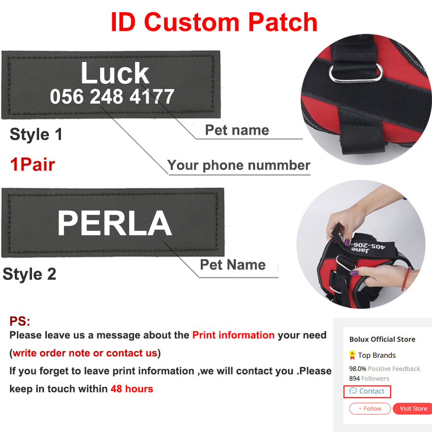 ☆Reply to the email order confirmation with the information you want us to print on the Velcro (eg: pet name + phone number eg: Luck 432 456 7897)