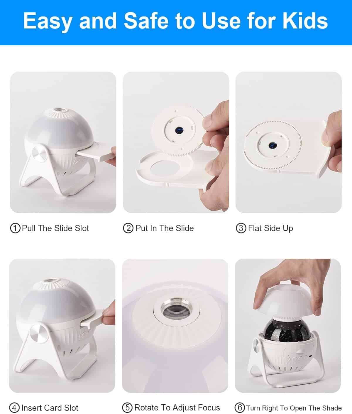 Easy to Use for Kids: Only 3 steps to take you through the planetarium visual experience: Insert film – Turn on switch – Adjust focus. Press the third button for two seconds to adjust the brightness (30%-70%-100%). Simple design perfect for kids using. Fun manual switching of film sheets helps children’s intellectual development.