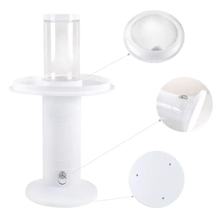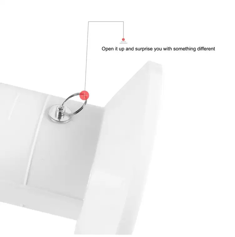 A small little key-ring-type device is located towards the bottom of the stand where a parent or creator of the cake can use to trigger the middle tube to pop open the internal gift from the top of the cake.