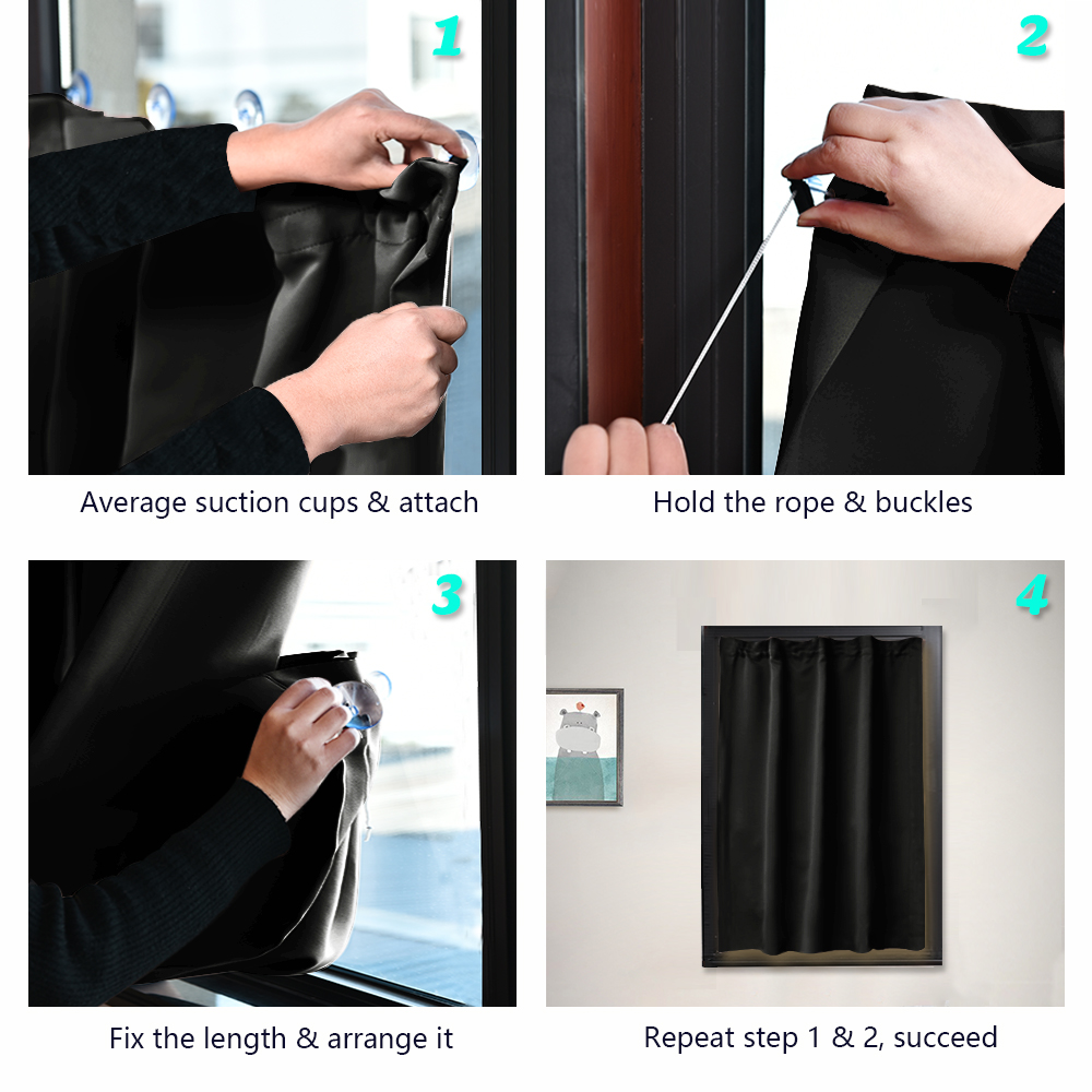 Easy to install: Our BLACKOUT SHADE CURTAIN uses the method of sucker sticking without any messy sticker or glue to damage window (Follow our pictures or packaging instructions).
