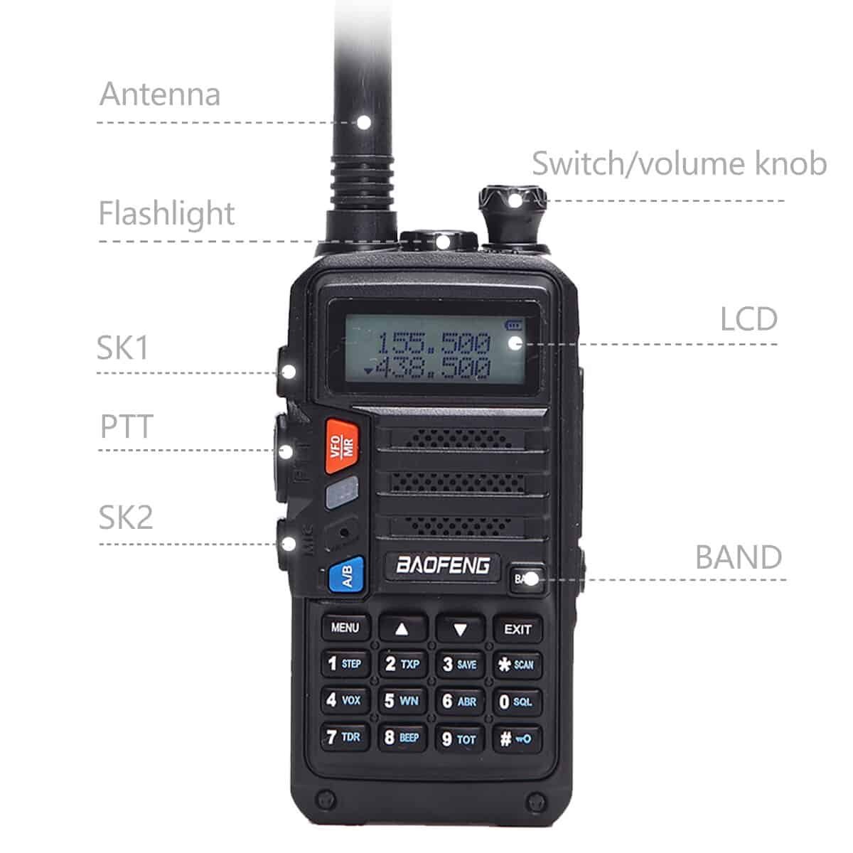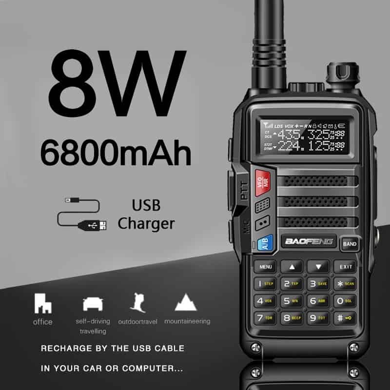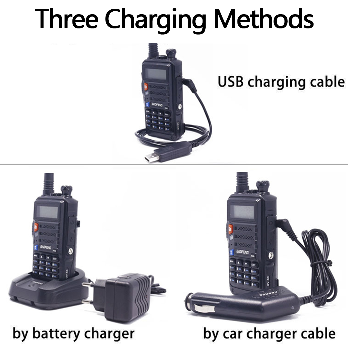 UV-5R is a powerful radio. with optional methods to charge the battery. But the standard does not include the USB cable and headset.