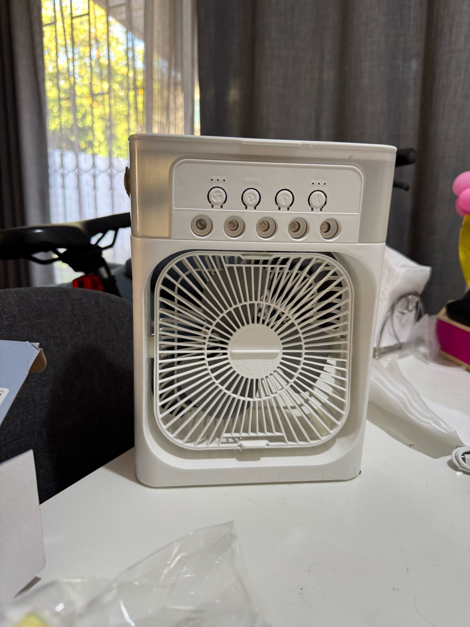 The portable water air conditioner also has a built-in LED light that can change colors according to your mood or preference. You can choose from seven soft colors or cycle through them automatically. The light is dimmable and can be used as a night light or a decoration.