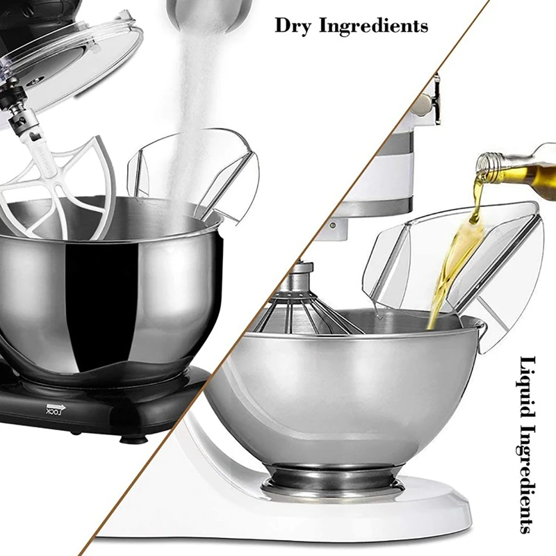 3. Easy to Use: This mixer splash guard can be easily installed on the top of the metal mixer bowl. Just adjust to stuck in the edge and put ingredients into the bowl through splash guard . When the paddle is working, the kitchen pouring chute will not stop the mixing process.