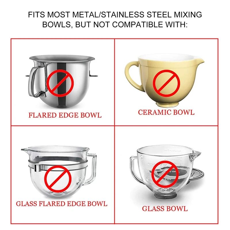 1. Accessories for Stand Mixer: As a kinds of kitchen accessory, our universal pouring shield is suitable for most brand stand mixers with metal bowls (compatible for KitchenAid stand mixers 4.5QT, 5QT, 6QT, etc.). But it is not suitable for glass bowls and flared edge bowls.