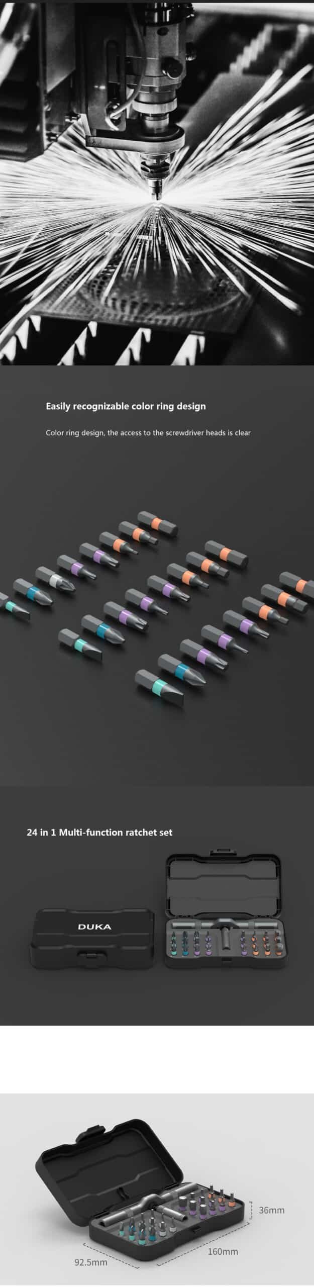1.【Multi-Purpose Ratchet Set】:This ratchet screwdriver come with 24 different shape driver bits: Phillips(PH1,PH2,PH3); Slotted(SL4,SL5,SL6);Pozidriv(PZ2); Torx (T5,T6,T8,T10, T15, T20, T25, T27);Hexagon(H1.5,H2,H2.5,H3,H4,H5,H6,H6.35,H8); basically covers common screw specifications for most home devices. And the different colour coded rings, make it easy to pick the right one.
