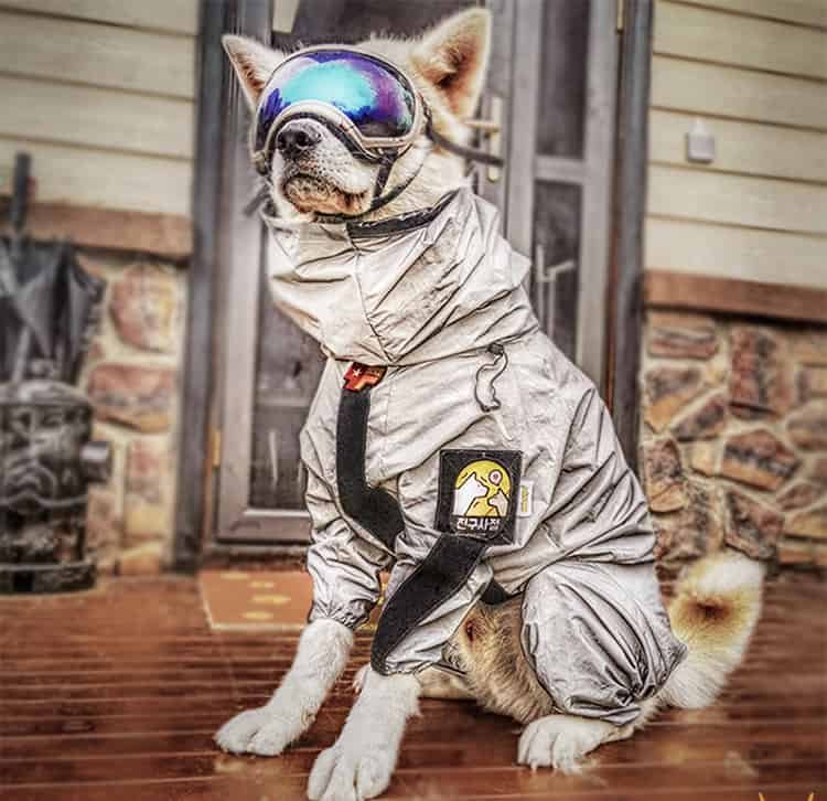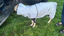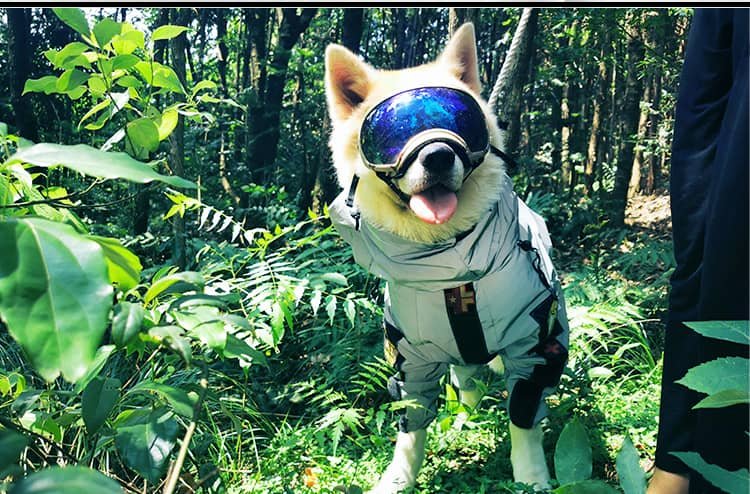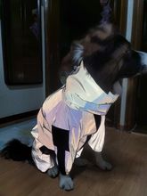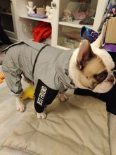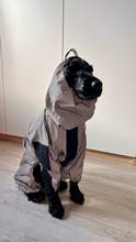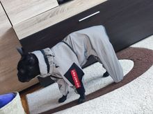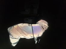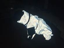 Cool jumpsuit. It was a little difficult to put on and remove the front legs. Maybe you need a little bigger size. Very beautiful reflective effect, the photo does not convey. Thank you!