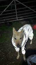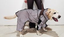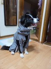 Good quality & fast shipping. My dog is large size. Neck: 44 cm=18",Chest: 81 cm=31.5", Back: 66cm=26". size 4XL fit just right. Openings for the important parts. Haven't tried it yet, waiting for a rainy day.