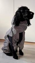 On the Russian Spaniel 13,3 kg, the back 45 sat well. In appearance, a normal raincoat, without a lining, rubberized zipper, a hood with ducklings, a slot for the leash. Glows like cataphota, patches on Velcro. The only thing that he unisex and Puzo turned out to be naked, I'll have to up. I did not communicate with the store. If I survive the season I'll take another one.