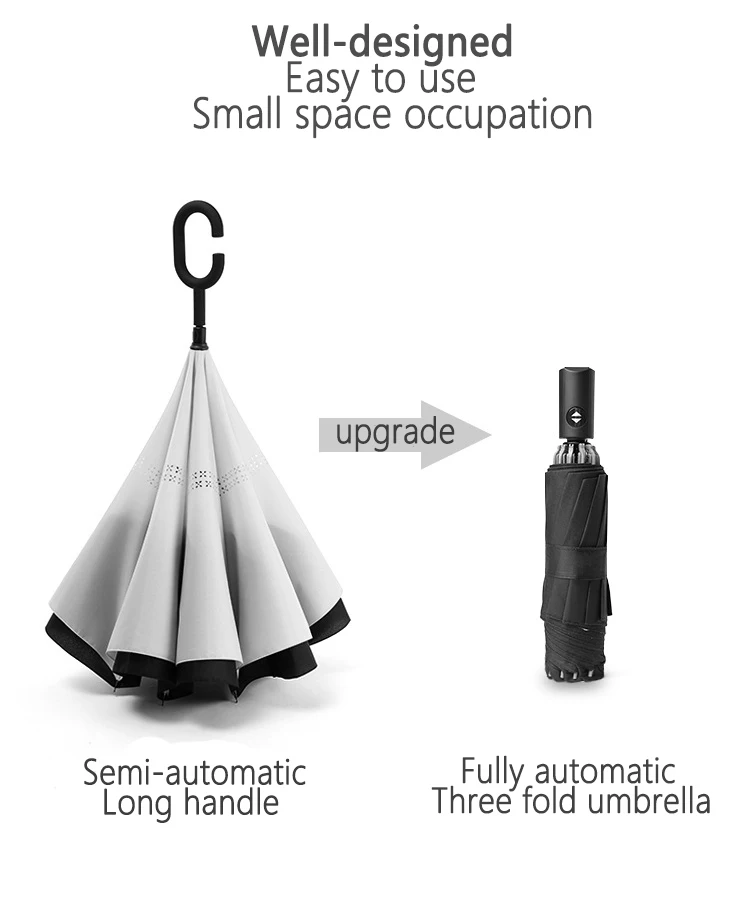 UPGRADE INVERTED DESIGN: Our upgraded inverted windproof umbrella adopts an inside-out design which is different from your traditional travel umbrella. When closing this umbrella, the wet part will be *inside* of the umbrella, preventing water from dripping and keeping floors/cars dry.