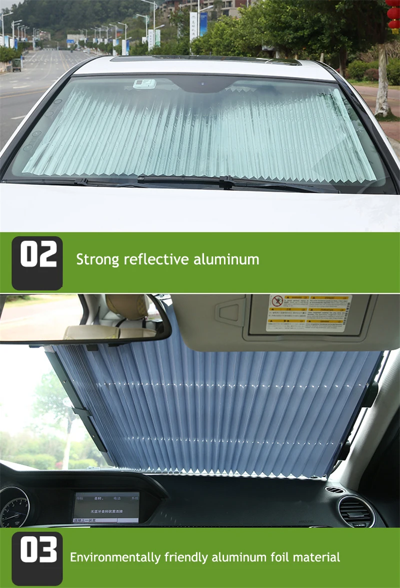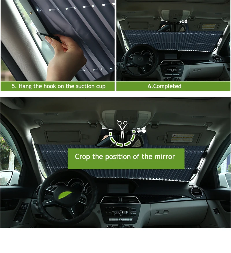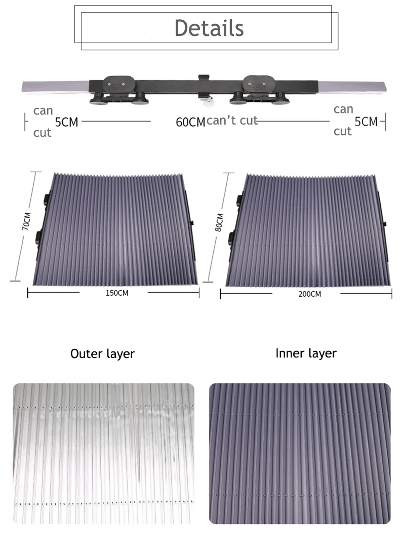 1.Upgraded and enlarged suction cup is firm and stable, four-point fixing, suction cup has better stability and stronger adsorption force, and can be used repeatedly. 2.The product is small and exquisite, easy to store. Upgrade double-wire box support without collapse. 3.Adopting double-wire box four-point fixing adsorption fan-shaped fold design and multi-angle reflection aluminum foil surface for good heat insulation and shading effect. 4.Outer layer of aluminized film, inner layer of photocatalyst, reflective aluminum foil, fan-shaped design, reflecting sunlight, heat insulation, high temperature resistance and corrosion resistance. 5.With 5cm of reserved space at both ends, it can be cut freely according to the size and hobby of the front windshield of your car.