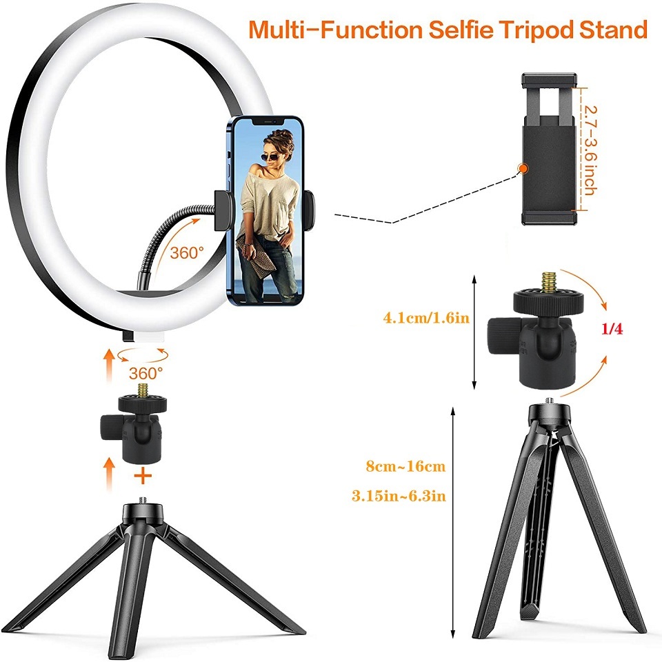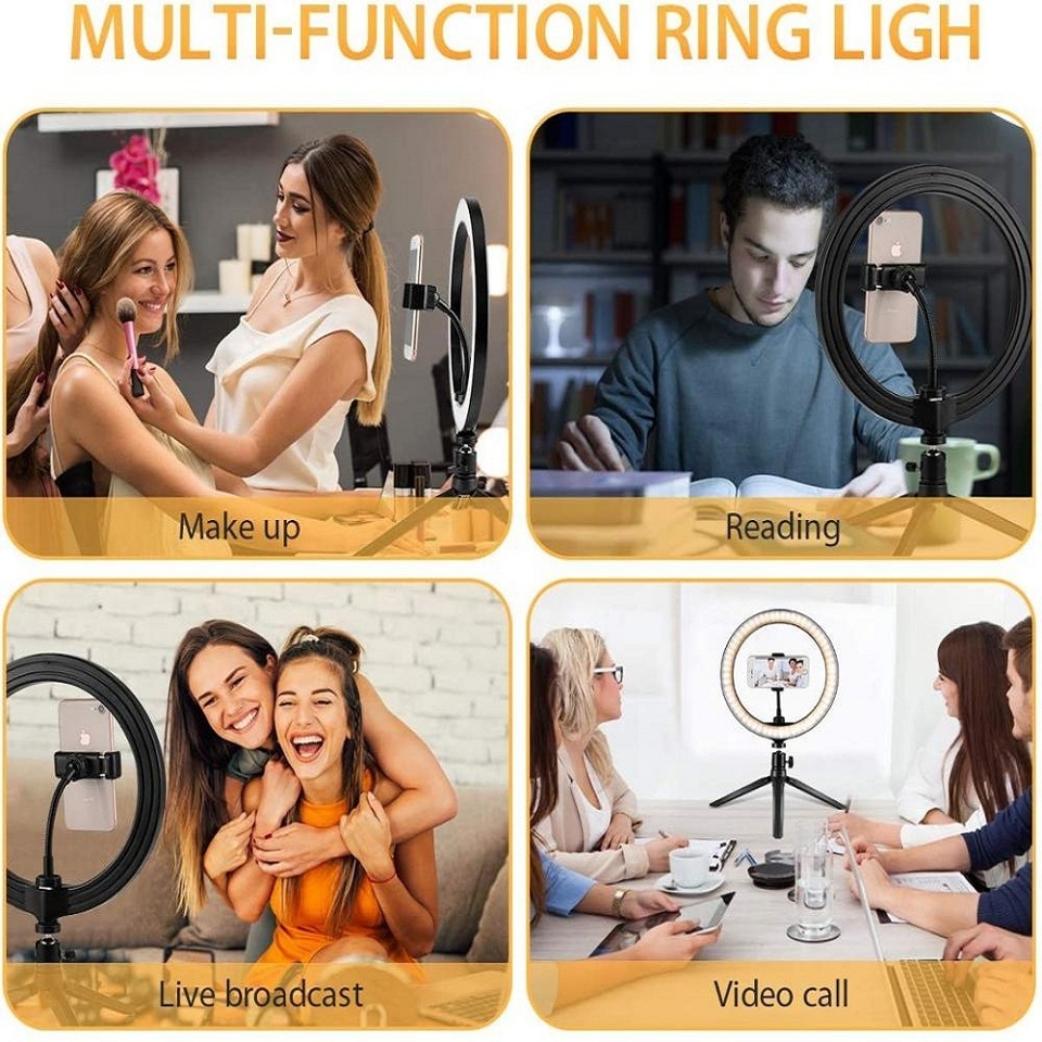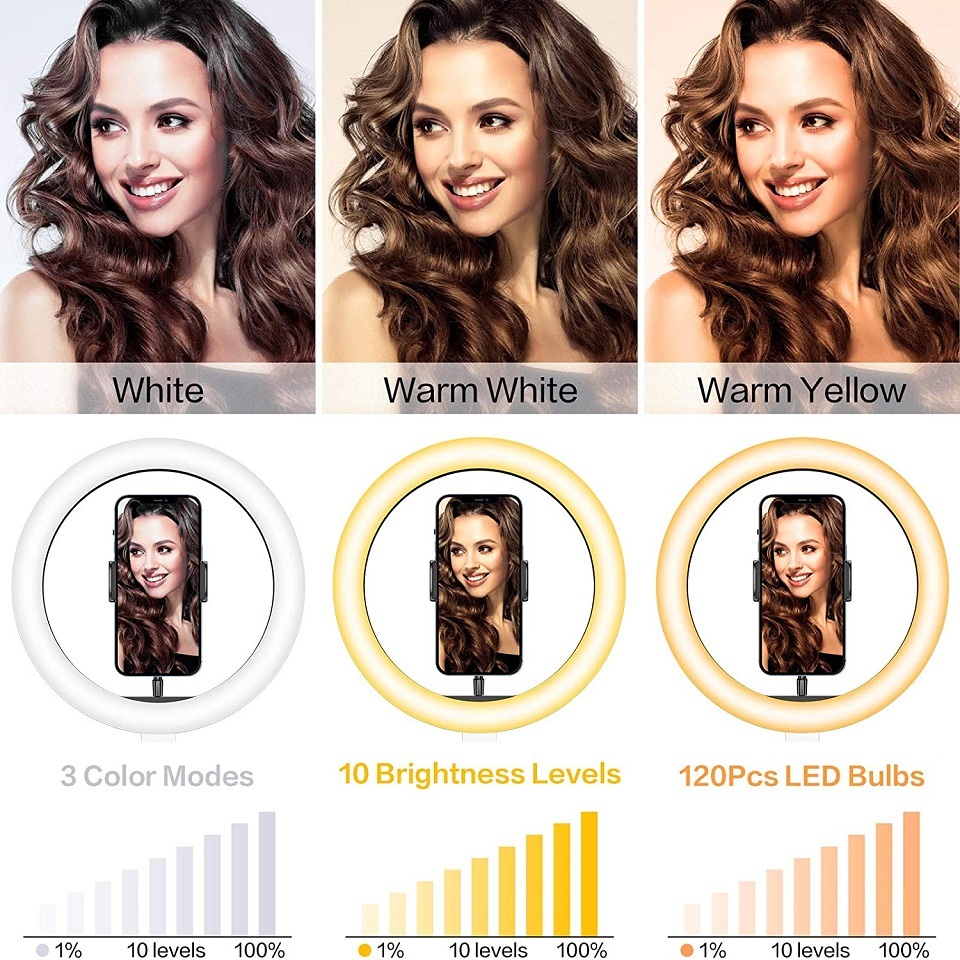 1. 10/8 inch Dimmable Ring Light>Ring Light features 3 color lighting modes: Warm Yellow, Cool White, Warm White. Each mode has 10 brightness levels to choose from, which helps you whenever you need extra light to remove the shadow for make up, taking photos and selifes, making videos, live streaming and more!