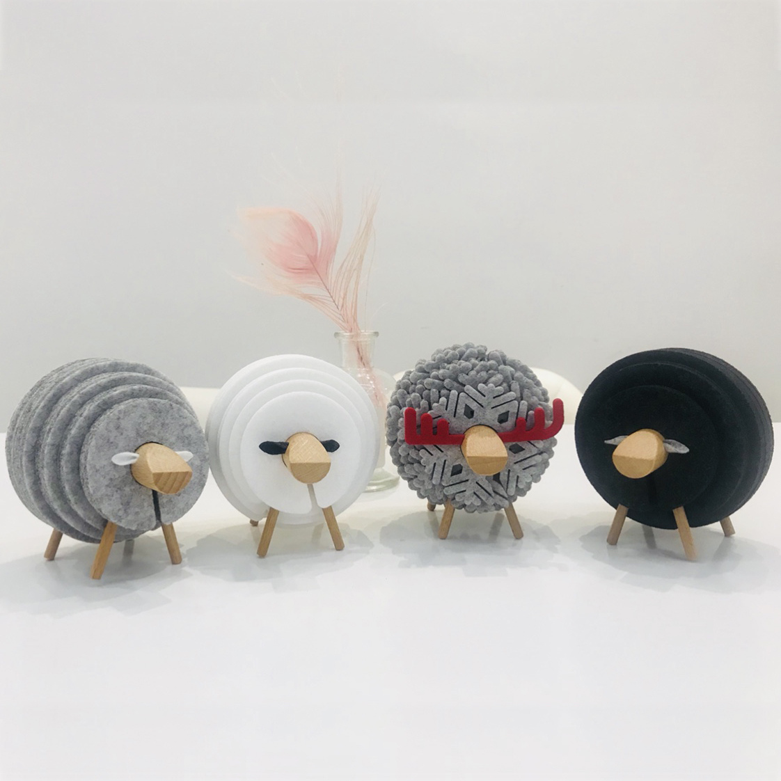 packed lamb in a branded box on which drawn instructions for assembly. stands-made of felt, body and legs wooden, the whole design without foreign smell. The stands absorb water well, do not slip, and of course, look just wonderful. Total of 14 pcs, different size. 5 pcs for 9 cm, 5 pcs for 7,5 cm, 2 pcs for 6,8 cm and 2 pcs for 6 cm. to remove the stand, the design does not need to be disassembled. each stand has a full cut, so just spread our snowflake and remove from the calf. wonderful thing, Colors your presence your home. I recommend buying.
