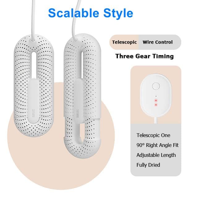 The shoe dryer is made of ABS UL94 V0 fire-retardant materials. Compression and high temperature resistance, not easy to burn and deform during use. The product size of the shoe dryer is the size of the palm of your hand. It can be easily stored in suitcases or carry-on bags.