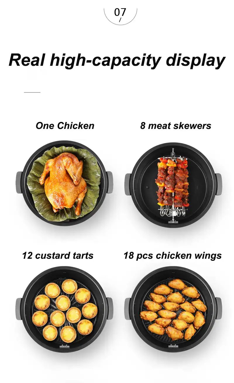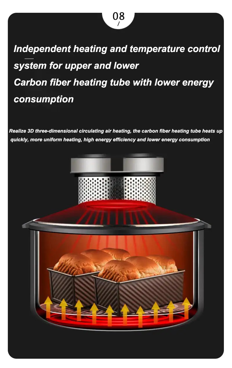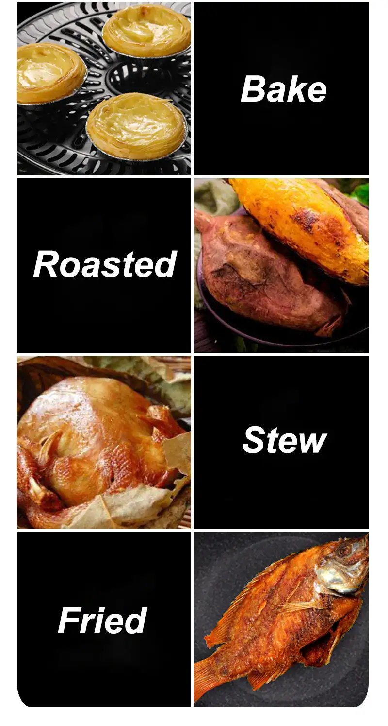 Our Air Fryer and Smart Baking Oven stands out with its multi-functionality. The oil-free cooking method not only lets you indulge in your favorite fried foods guilt-free but also keeps your meals healthy and nutritious. The advanced heating technology ensures your food is cooked to perfection, retaining its natural flavors and textures. Plus, the spacious 8L capacity means you can cook for the whole family in one go.