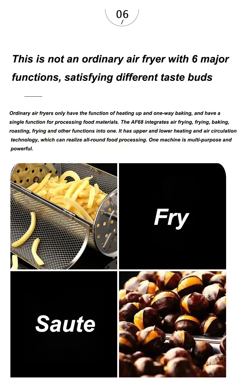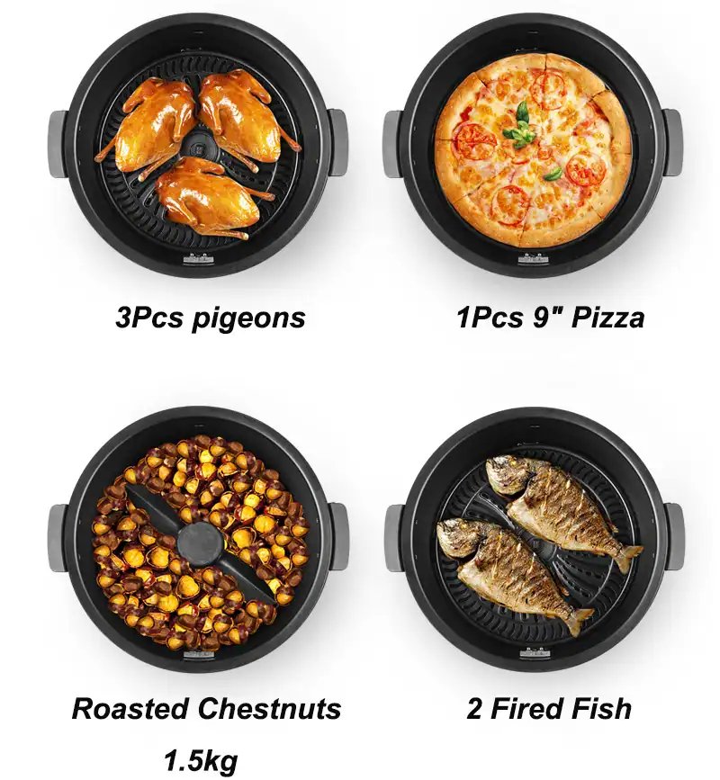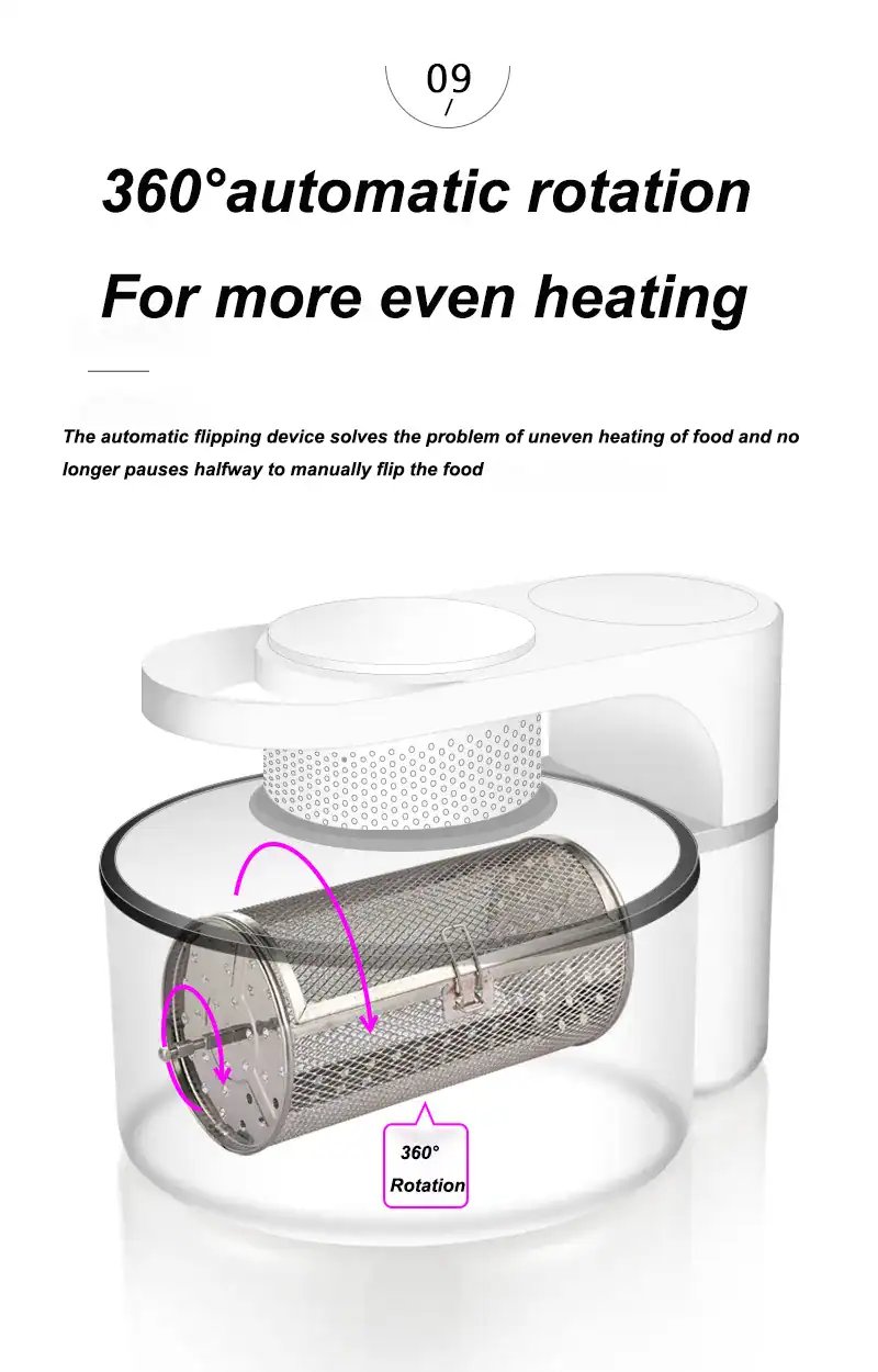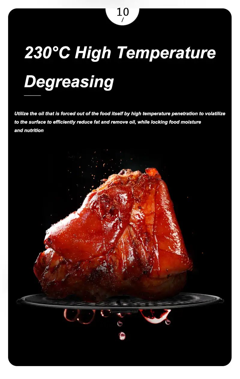 Our Air Fryer and Smart Baking Oven stands out with its multi-functionality. The oil-free cooking method not only lets you indulge in your favorite fried foods guilt-free but also keeps your meals healthy and nutritious. The advanced heating technology ensures your food is cooked to perfection, retaining its natural flavors and textures. Plus, the spacious 8L capacity means you can cook for the whole family in one go.