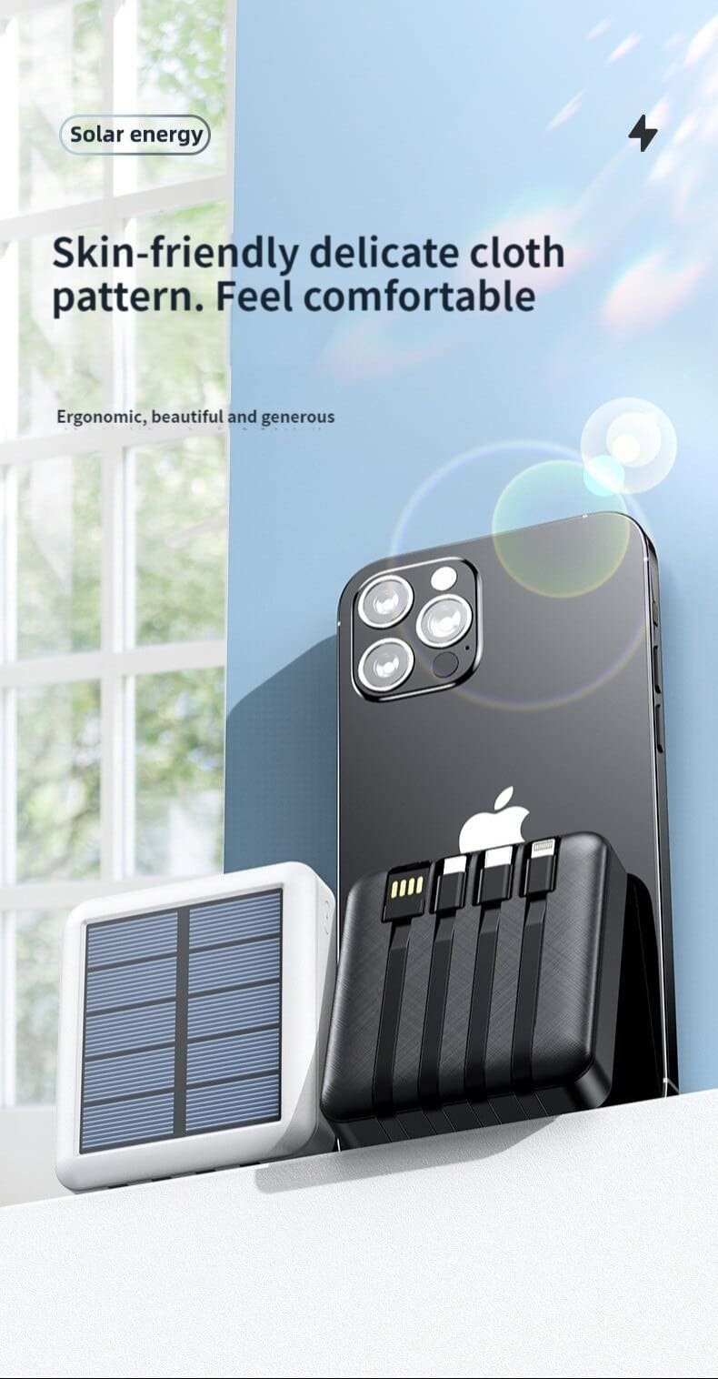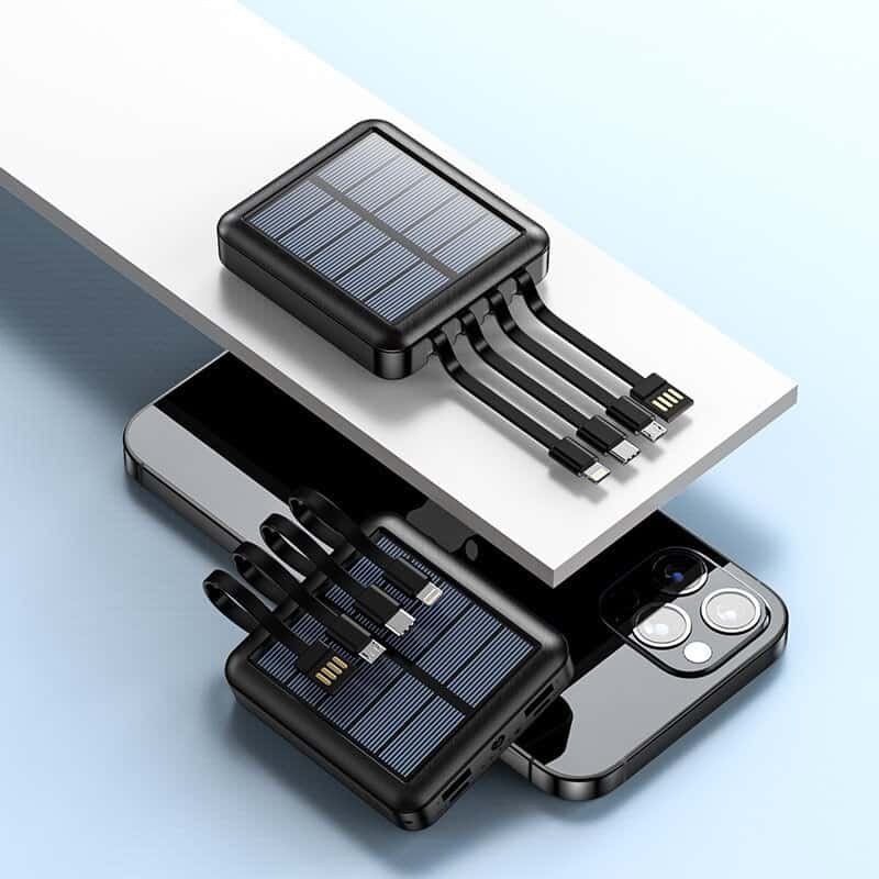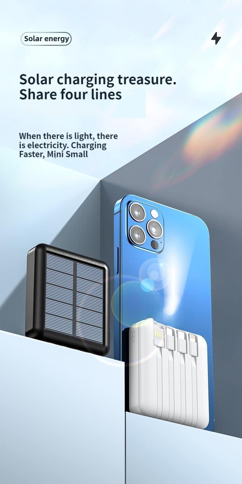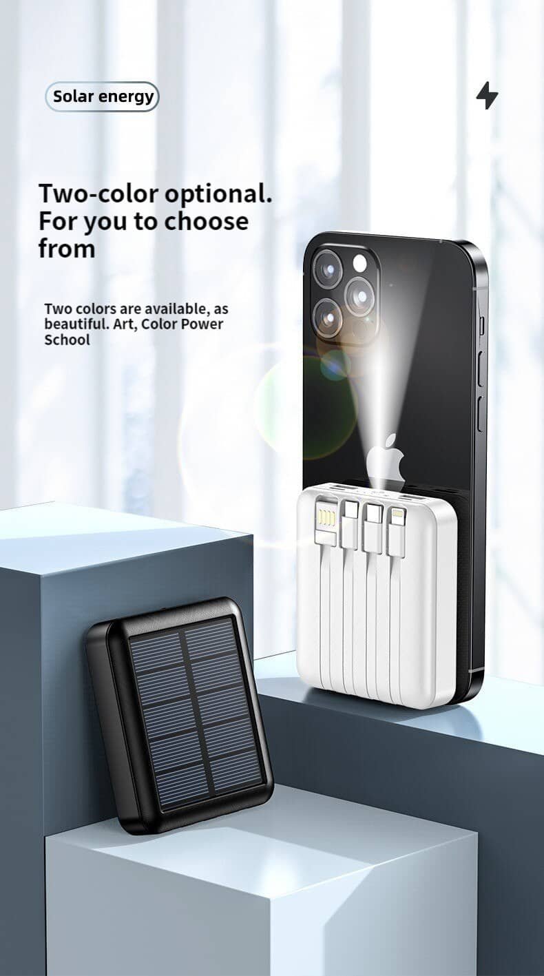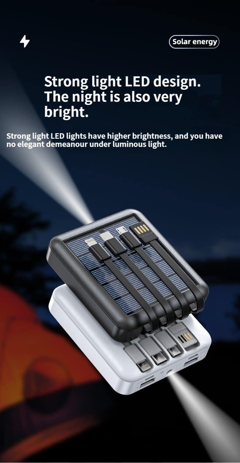 The Mini Solar Charging Power Bank comes with four lines, a bright LED flashlight and a lanyard.