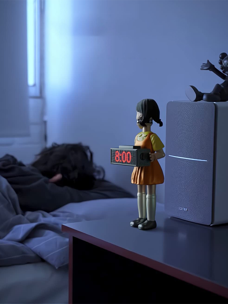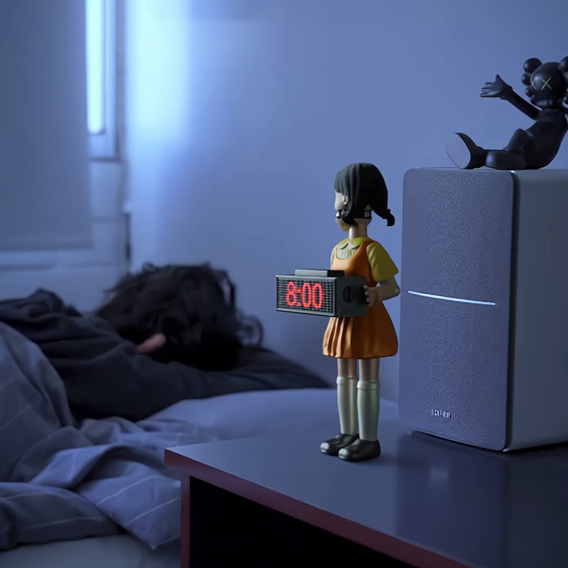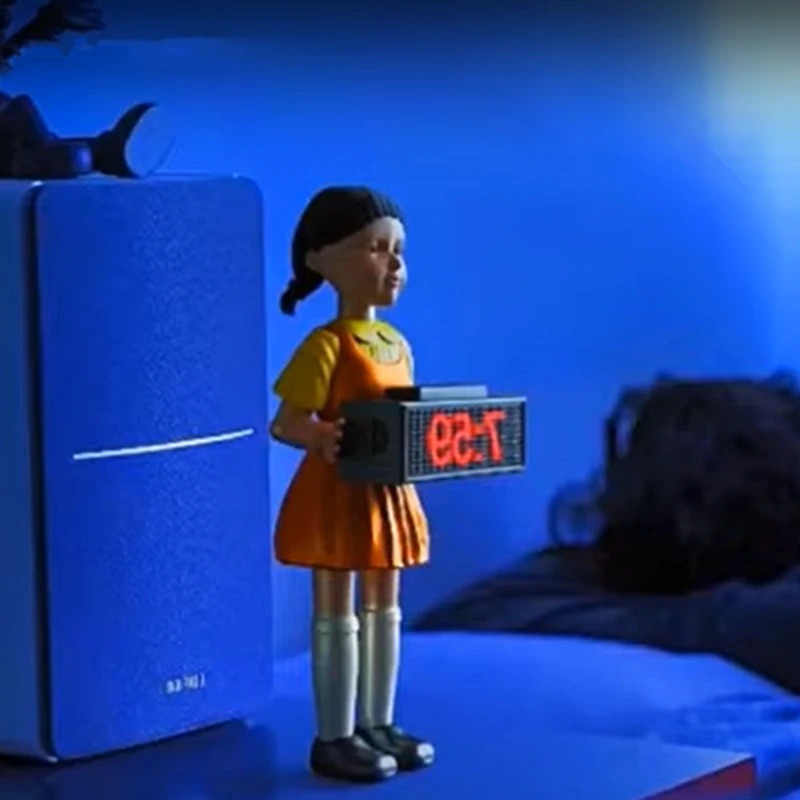 Having trouble every time you wake up? Don’t worry, you will immediately wake up to the sound of our Squid game alarm clock. The product designed according to the hottest squid game of 2021, wake you up in a unique way and make you refreshed every morning. It has the shape of a counting doll-like in the movie, highly detailed face and hands are hand-painted resin, perfect restoration. The alarm clock has two versions, the ordinary version is a doll that glows and has a scary sound, or the upgraded version includes the rubber bullet that can be fired. Moreover, it will be the best decoration in your bedroom, get it quickly and show it off to your friends. This is the best gift for squid game lovers. Buy right now!