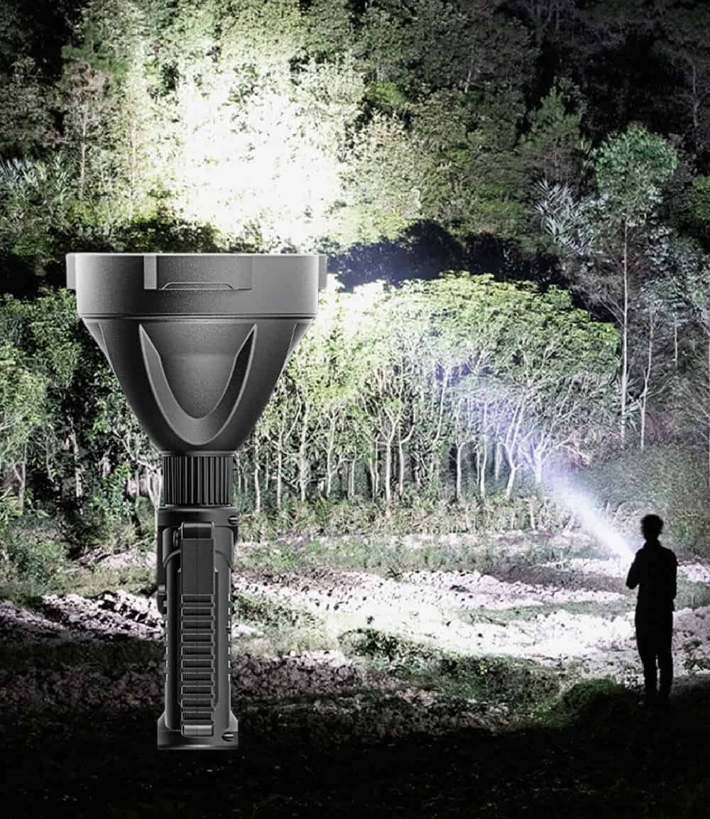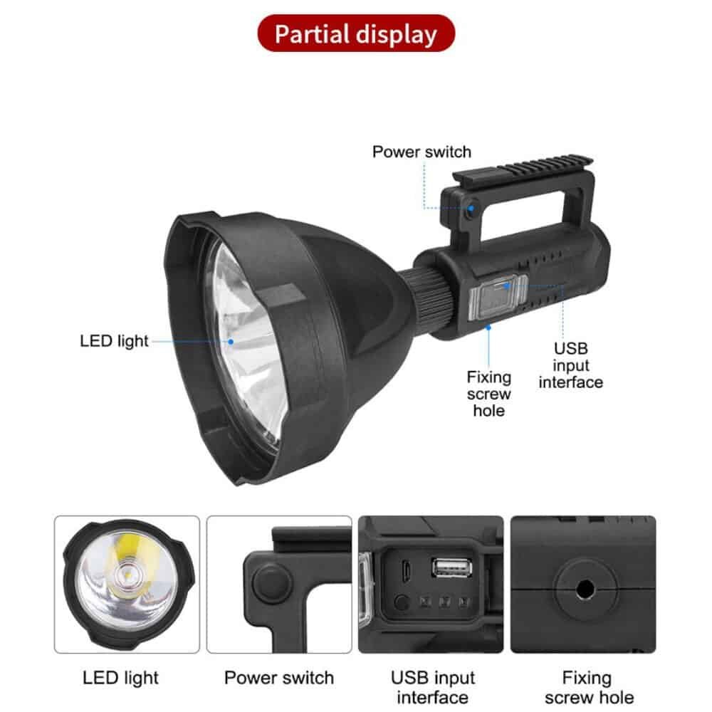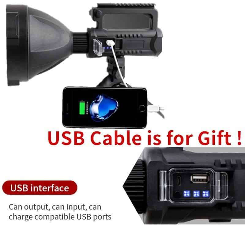 Are you looking for a bright flashlight for your camping trip? Introducing to you our LED handheld super bright spotlight. This is a 90000 lumens LED Spotlight flashlight, which adopts XHP series lamp beads to provide super bright light, and the beam distance exceeds 1500 meters. Light up your way forward. High lumens flashlights with 4 lighting modes: low brightness, medium brightness, high brightness, and strobe. In addition, the IPX5 grade waterproof flashlight can be used normally in any bad weather such as rain or snow. Its shell is made of high-quality ABS material, which is wear-resistant, durable, and resistant to falling. Its luminous part is made of high brightness LED, which has a long service life. LED spotlight flashlight provides reliable and convenient lighting tools, very suitable for ships, seas, hiking, hunting, outdoor camping, night fishing, walking dogs, car maintenance, work, and other conditions. You will find that this spotlight flash will be your ideal companion. Buy now!
