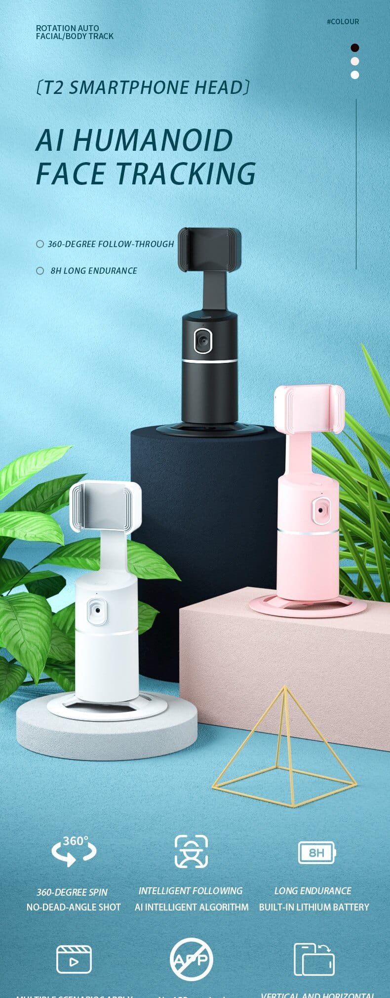 Never miss a frame again with our Face tracking camera mount. It is a next-generation gimbal featuring AI algorithm-driven, auto recognizes, and tracks your face or body as you move in front of it. This tripod has a built-in camera system, which can track and rotate intelligently. It does not use an app to track so you can freely use all the functions of the mobile phone when shooting. With a built-in 2200 mAh rechargeable lithium battery, it can work continuously for 6-8 hours after fully charged. Our product is perfect for video calls, live streaming, tutorials, performance videos, and many more! What are you looking for? Buy now!