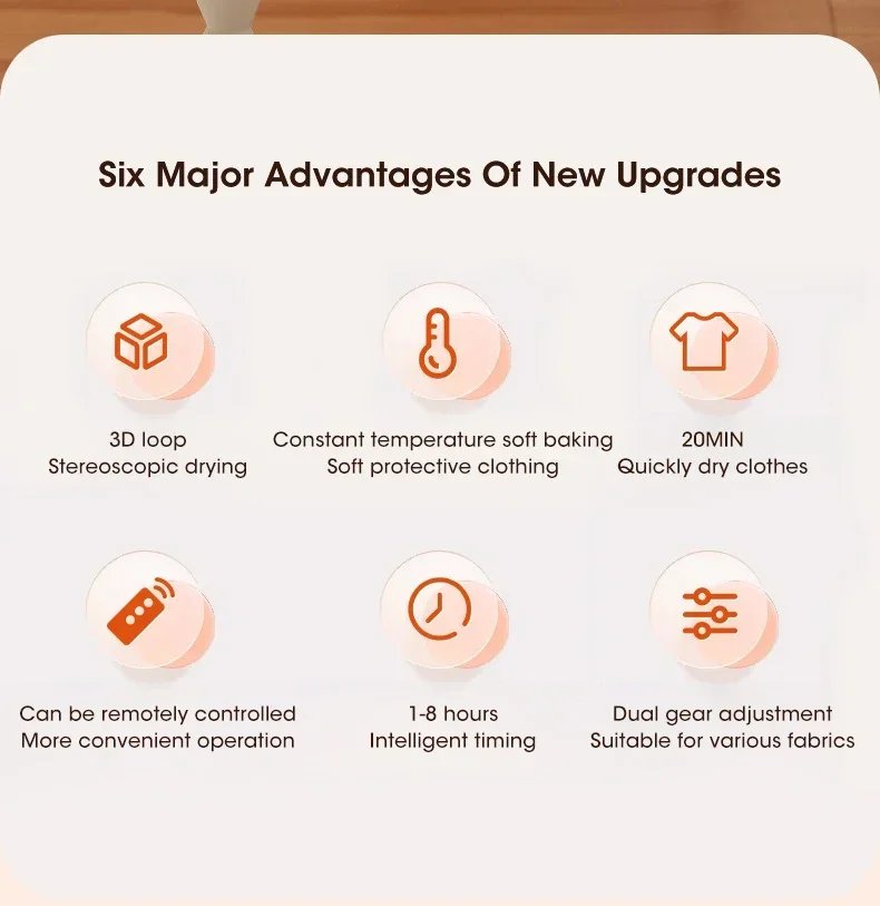Quick Drying Technology: Uses gentle warm air to dry clothes in as little as 30-60 minutes, depending on fabric type.