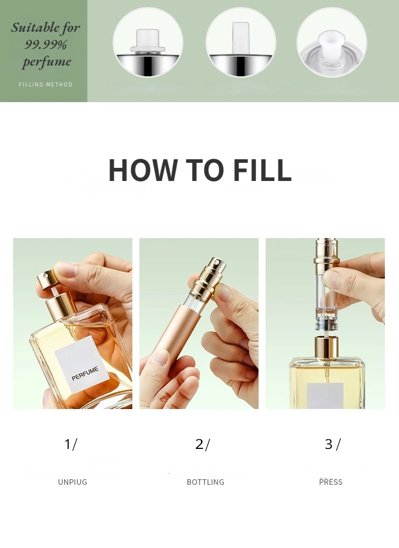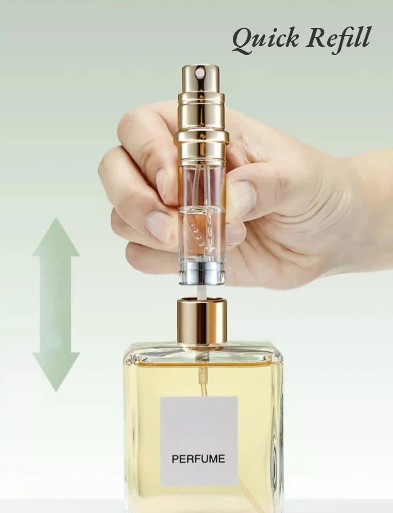 • Refilling the Travel Perfume Bottle is a breeze. Simply remove the spray nozzle from your full-sized perfume bottle, align the bottom of the travel bottle with the nozzle, and pump to transfer the fragrance. It’s quick, easy, and mess-free.