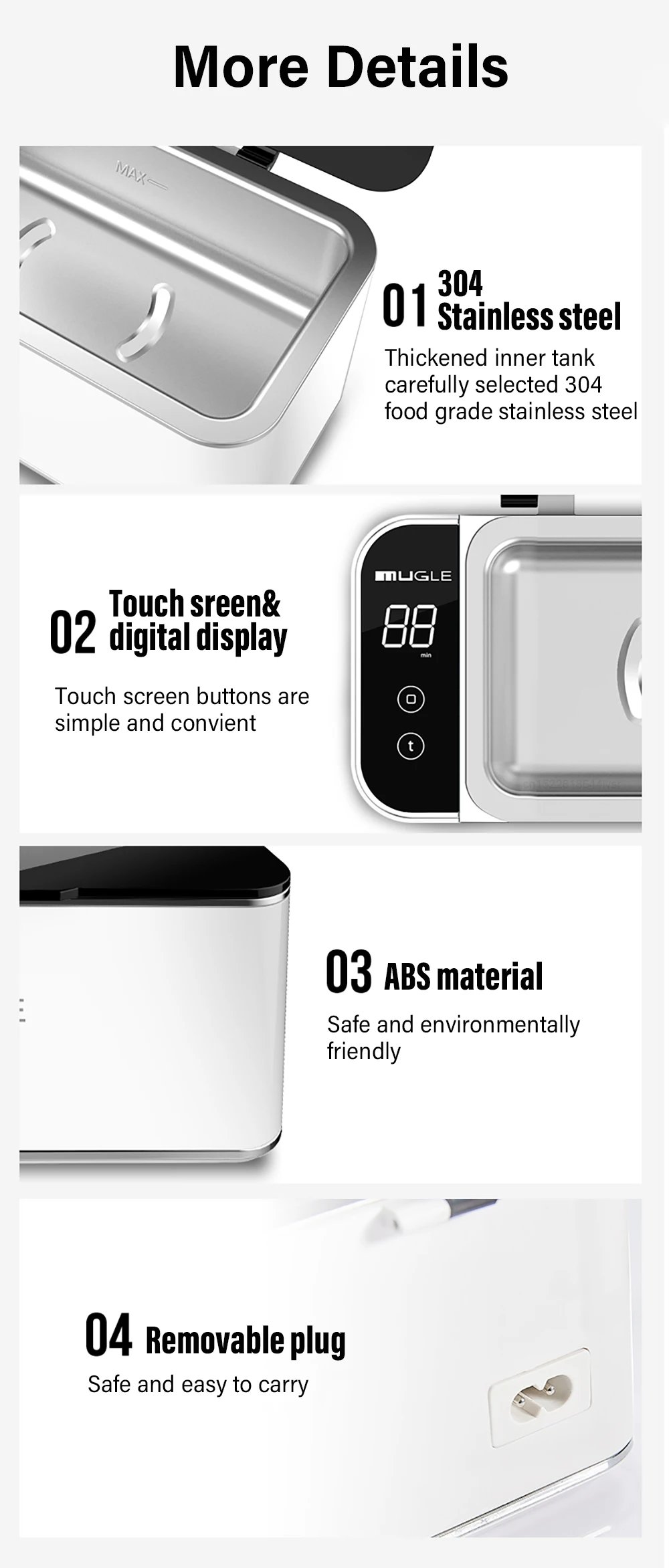Large capacity: Our ultrasonic cleaner has a substantial capacity of 500 ml, allowing it to hold a variety of items at the same time. To complement this ample space, the cleaner is built to last with a 304 stainless steel inner tank and an ABS outer shell, adding to its durability and elegance.