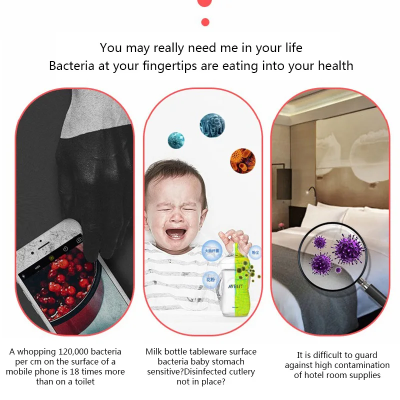 Built-in automatic safety switch, when rotating sterilization stick lamp face up, the ultraviolet lamp will turn off automatically, If you want to return to the working state, you just need to rotate the bactericidal rod and the lamp tube face down.