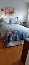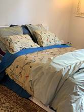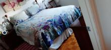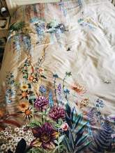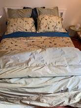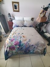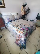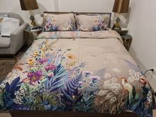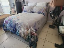 This is a beautiful doona/duvet cover. It is printed and made well, and is beautifully soft to touch. In the pictures I have a king size doona on a queen sized bed.