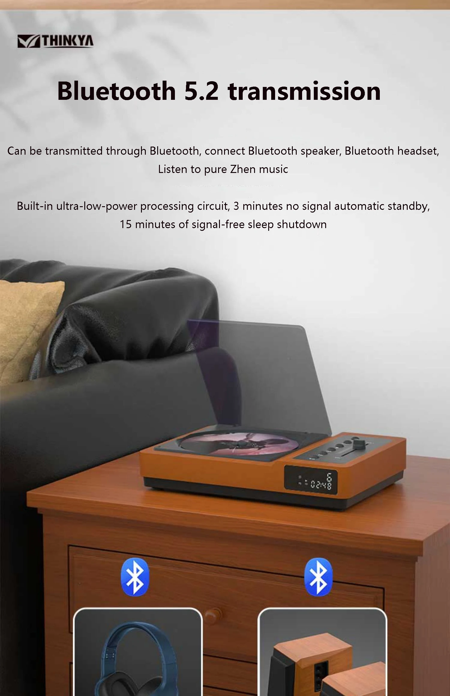 9: Can be transmitted through Bluetooth 5.2, connect Bluetooth speakers, Bluetooth headphones, listen to pure Zhen music. Built-in ultra-low-power processing circuit, 3 minutes no signal automatic standby, 15 minutes no signal sleep shutdown.