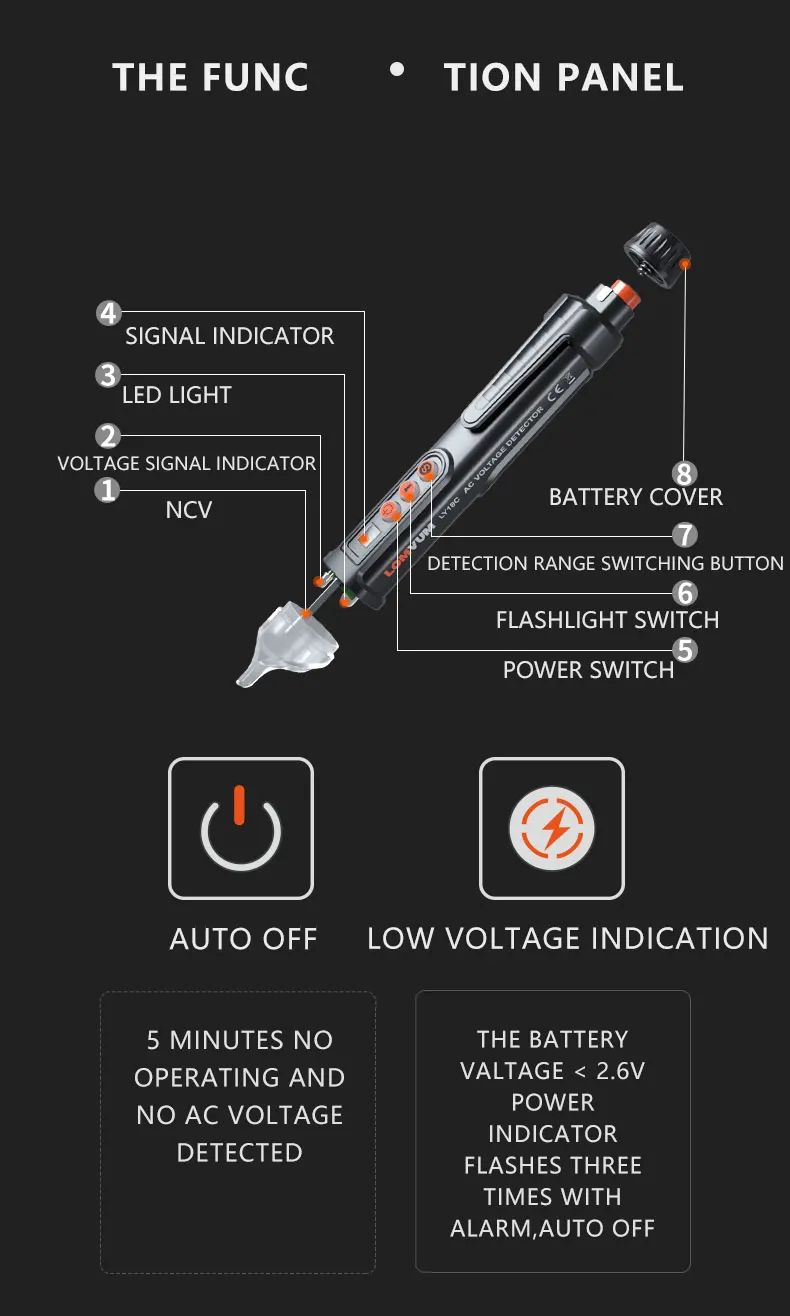 4. Auto power off: Voltage tester will automatically power off after 3 minutes of no AC voltage detection.