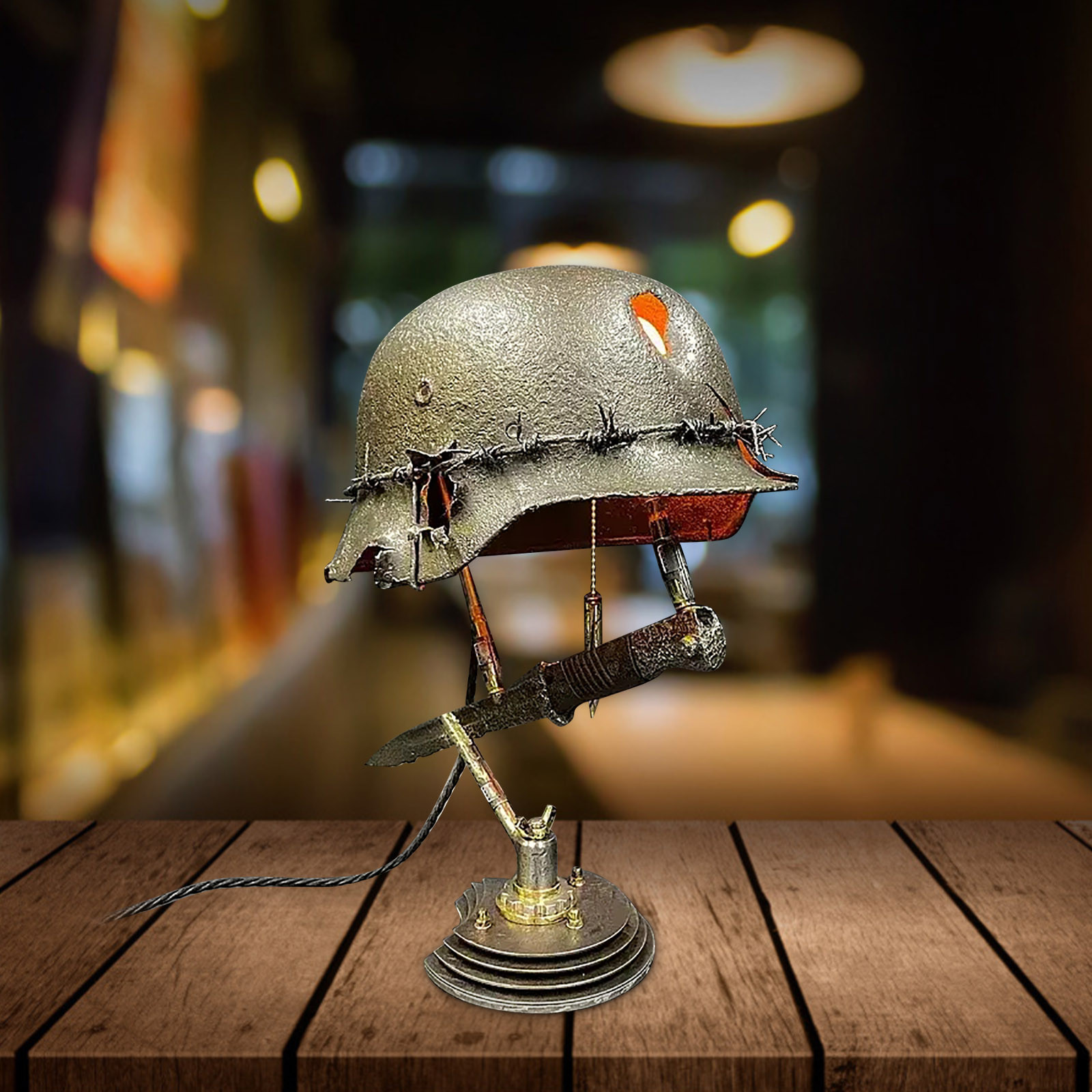 The war is over and leaves behind damage and pain that is hard to erase. Therefore, we manufacture this War relics lamp to commemorate and remember that terrible history. Each lamp is made of helmets, bayonets, and bullets from World War II. These helmets bear witness to that cruel history. The lamp has been professionally wired and has passed a UK PAT electrical safety test. The Helmet is a German M1942 and was recovered from the 1944 Narva battlefield in Estonia. The bayonet is a German K98 recovered from Berlin Lamp is fitted with a 3 mode flame effect LED bulb, there’s a video on the home page showing the flame effect. This is a very meaningful work of art. It’s the perfect gift for a military fan. Buy right now!