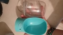 Quite large in volume and feels from half a liter of water inside despite the light plastic. Plastic without smell. The muzzle of the 6-month-old French bulldog entered perfectly-he began to drink immediately. The capacity is deep, the water can be recruited at a time. It is very convenient that the balance can be merged back. Recommend for Bulldog