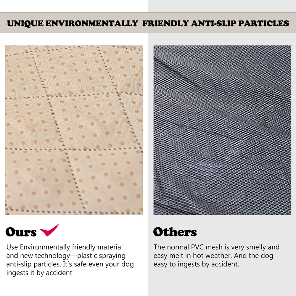 UNIQUE ENVIRONMENTALLY FRIENDLY ANTI-SLIP PARTICLES. Different from other dog seat covers for back seat, Winner Outfitters dog car seat covers use unique plastic spraying anti-slip particles rather than normal plastic skid net. It’s safe even your dog ingests it by accident. Moreover, the anti-slip particles won’t melt like plastic skid net in hot weather.