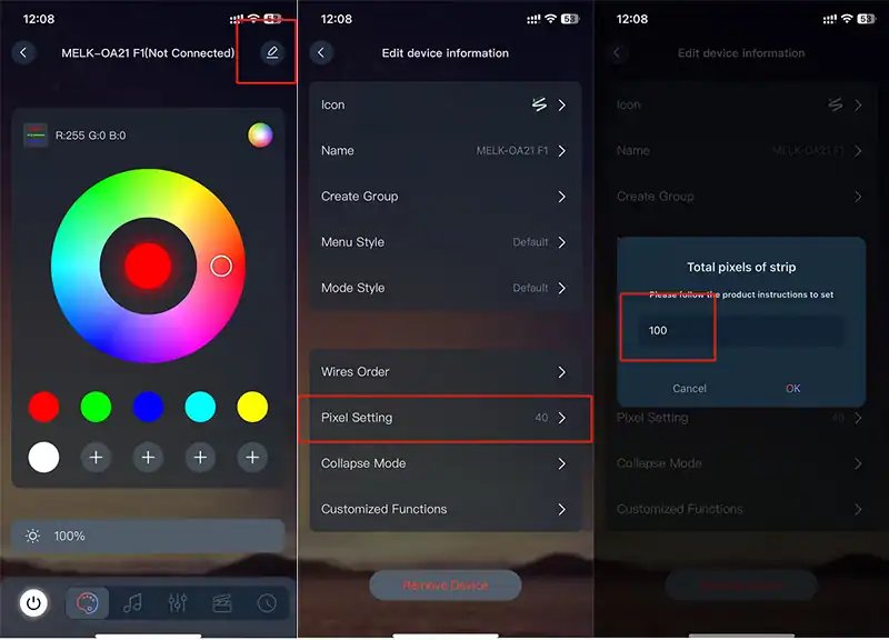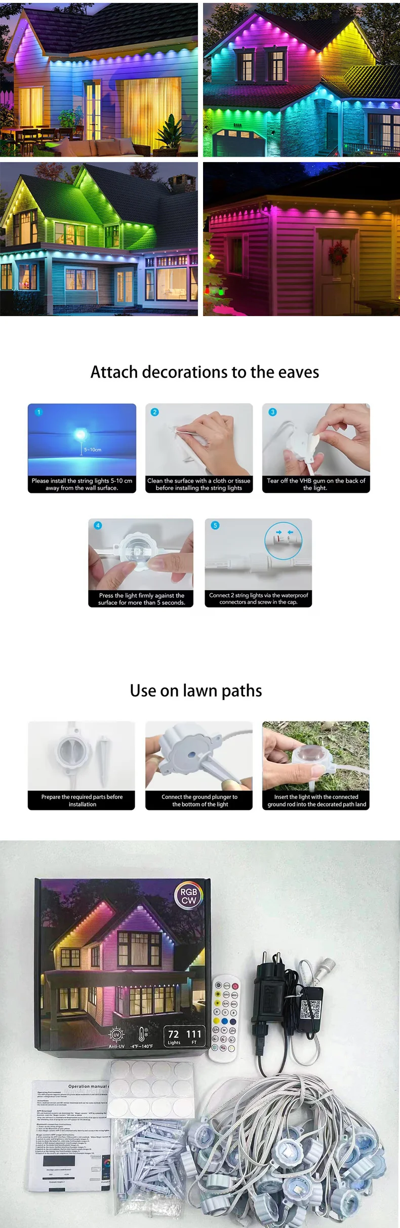 Individually control the color of each led light via app; easily control via the remote get multiple functions; Also directly change the color for the whole strand, adjust brightness, RESET.