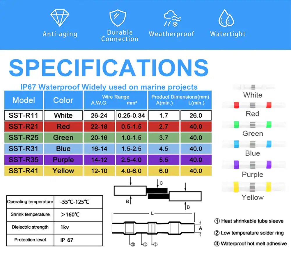 Are you tired of messy wires and unreliable connections? Do you want to save time and money on your electrical projects? If you answered yes, then you need Boxed Waterproof Solder Wire Connectors! This amazing product lets you join wires with ease and confidence. Just insert the wires into the connector, heat it up with a heat gun, and watch as the solder melts and seals the connection. No crimping, no soldering, no hassle! Boxed Waterproof Solder Seal Connector is waterproof, corrosion-resistant, and durable. It works with various wire sizes and types, and comes in a handy box for easy storage and transport. Whether you need to fix your car, boat, home, or hobby, Boxed Waterproof Solder Seal Connector is the perfect solution for you. Order now and get a special discount on your first purchase. Don’t miss this opportunity to get the best connector on the market. Boxed Waterproof Solder Seal Connector – the ultimate choice for your wiring needs!